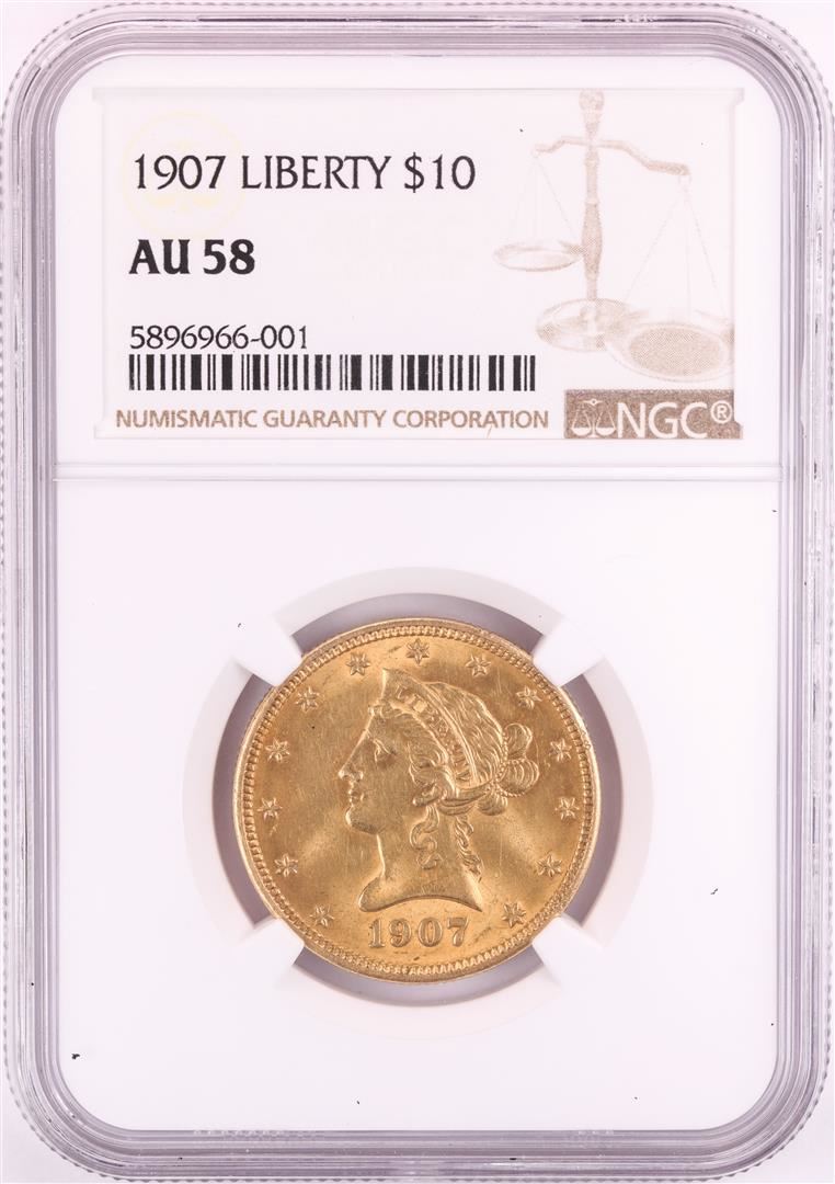 One 1907 $10 Liberty Head Eagle Gold Coin NGC AU58. NGC Certified.