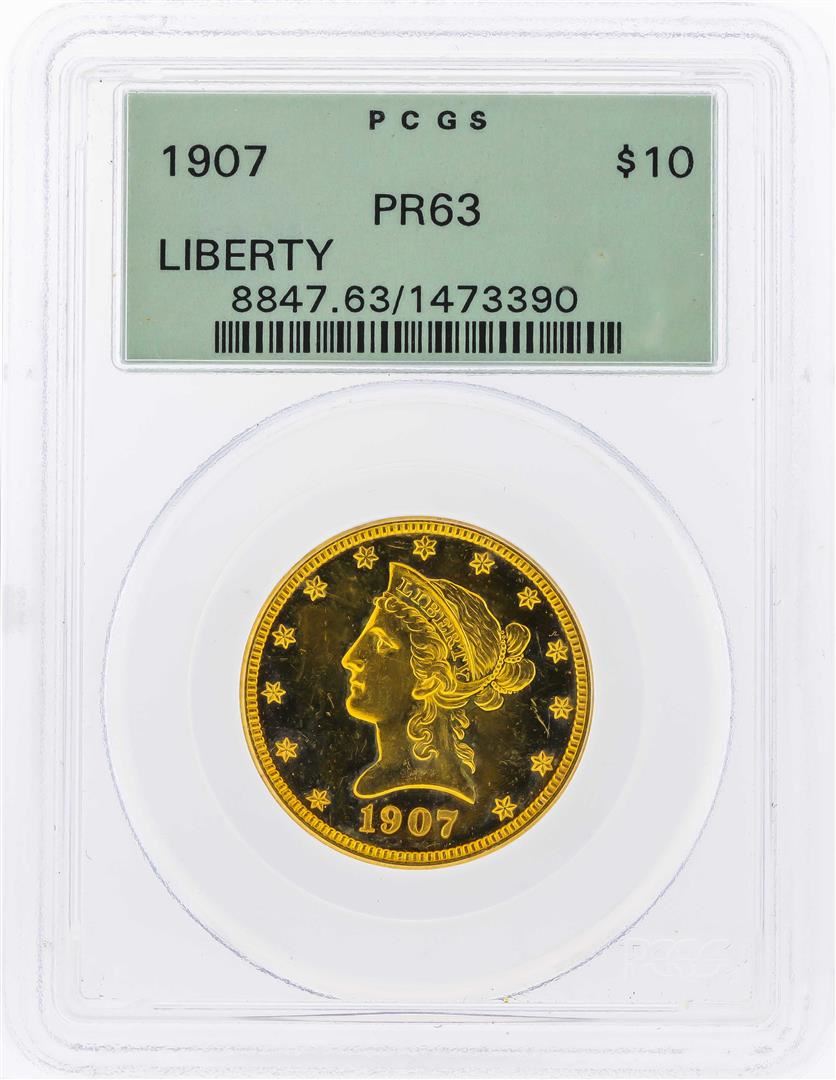 One 1907 $10 Liberty Head Eagle Gold Coin PCGS Graded PR63 can only be described as "Wholly original". A sparkling and very choice example of this last year of the Liberty Head Housed in an old PCGS green label. PCGS Graded.