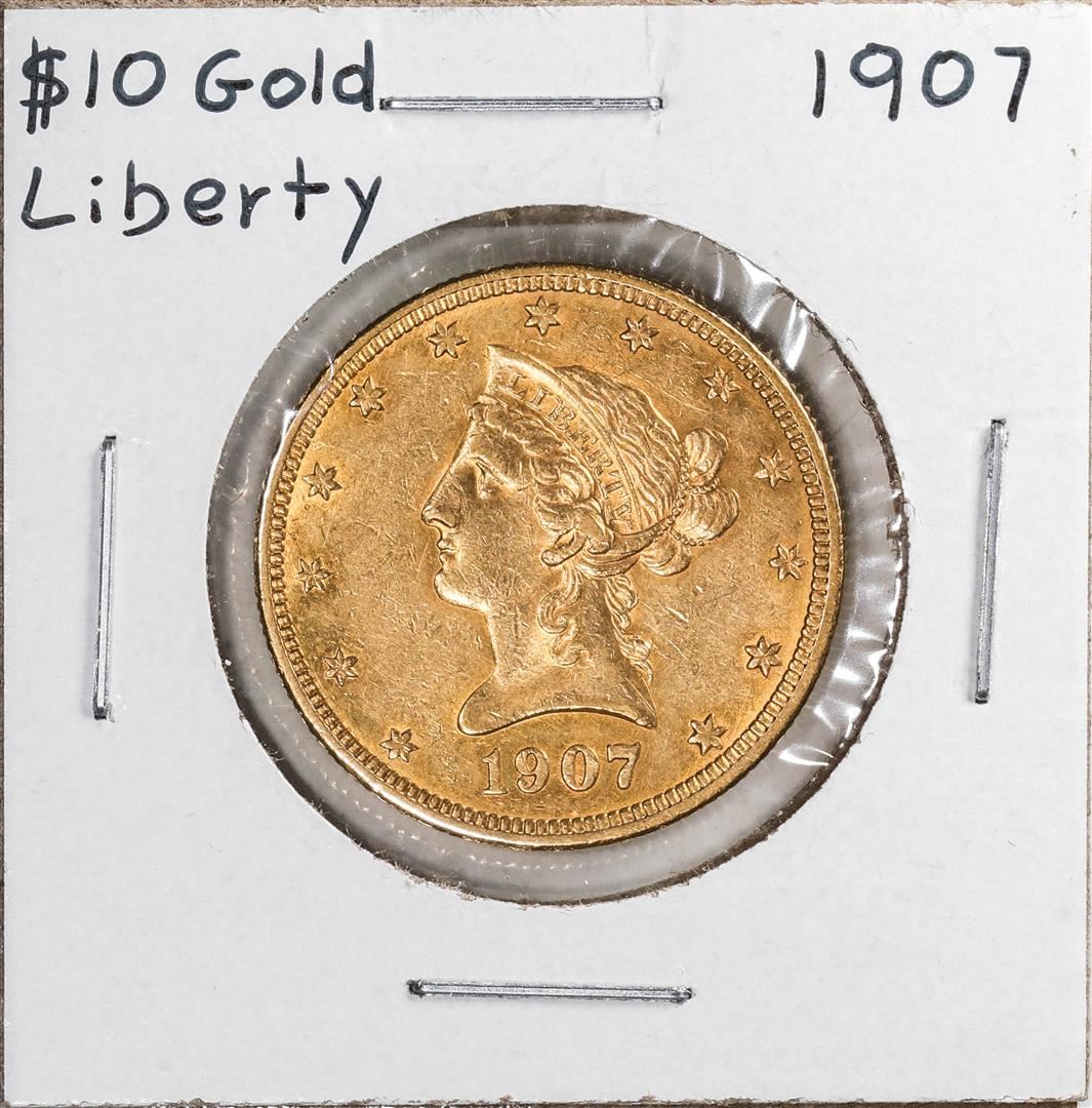 One 1907 $10 Liberty Head Eagle Gold Coin.