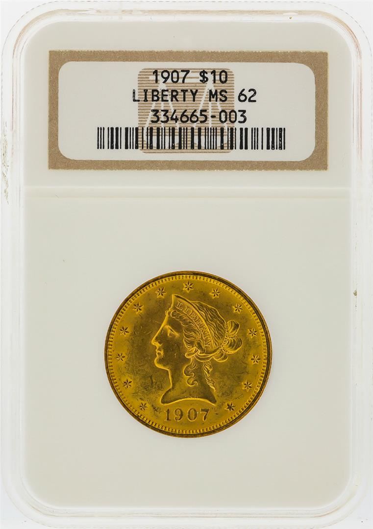 One 1907 $10 Liberty Head Gold Coin NGC Graded MS62. NGC Certified.