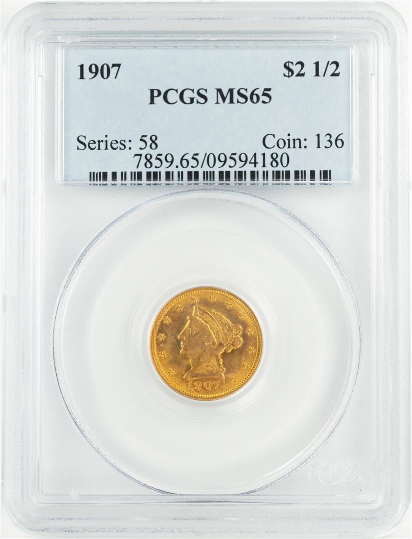 One 1907 $2 1/2 Liberty Head Quarter Eagle Gold Coin PCGS MS65. PCGS Graded.