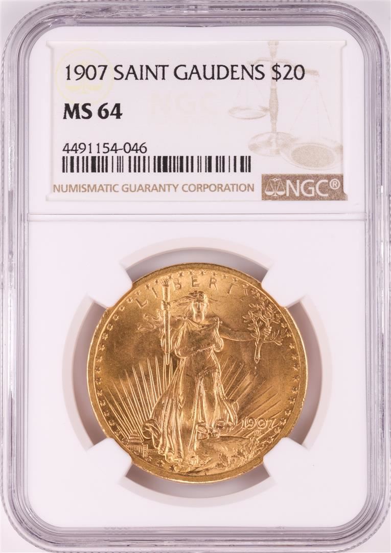 One 1907 $20 Liberty Head Double Eagle Gold Coin NGC MS64, please note that the plastic on the holder is chipped. NGC Certified.