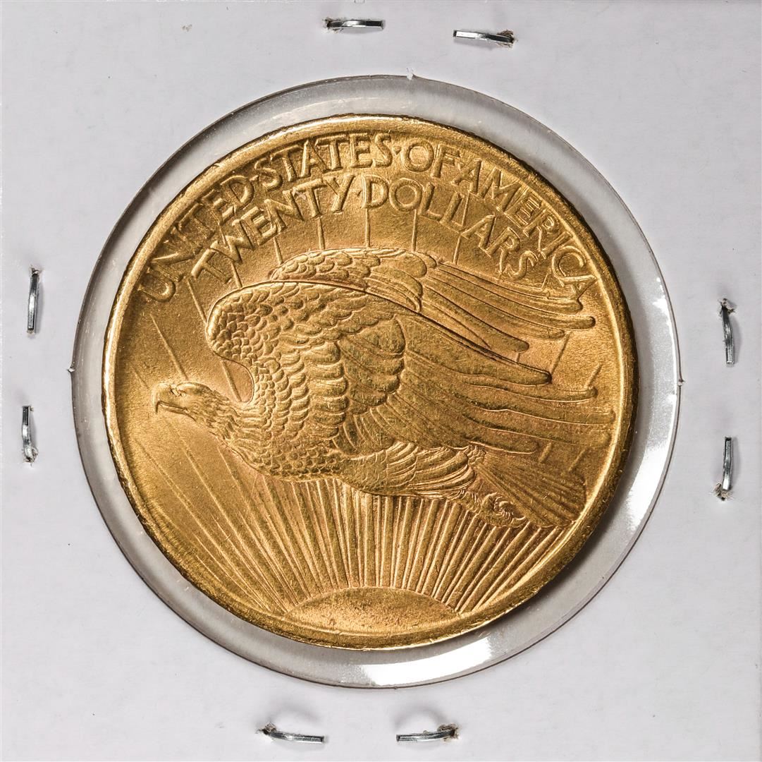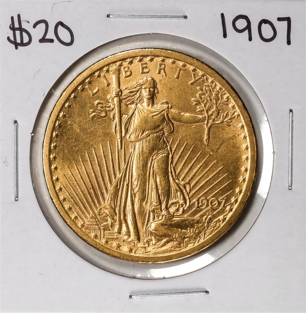 One 1907 $20 St. Gaudens Double Eagle Gold Coin.