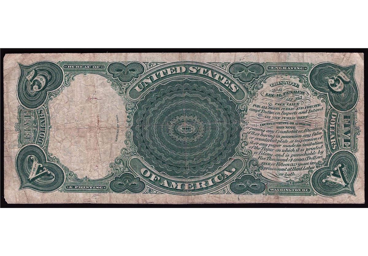 One 1907 $5 Large Size Woodchopper Legal Tender Note.