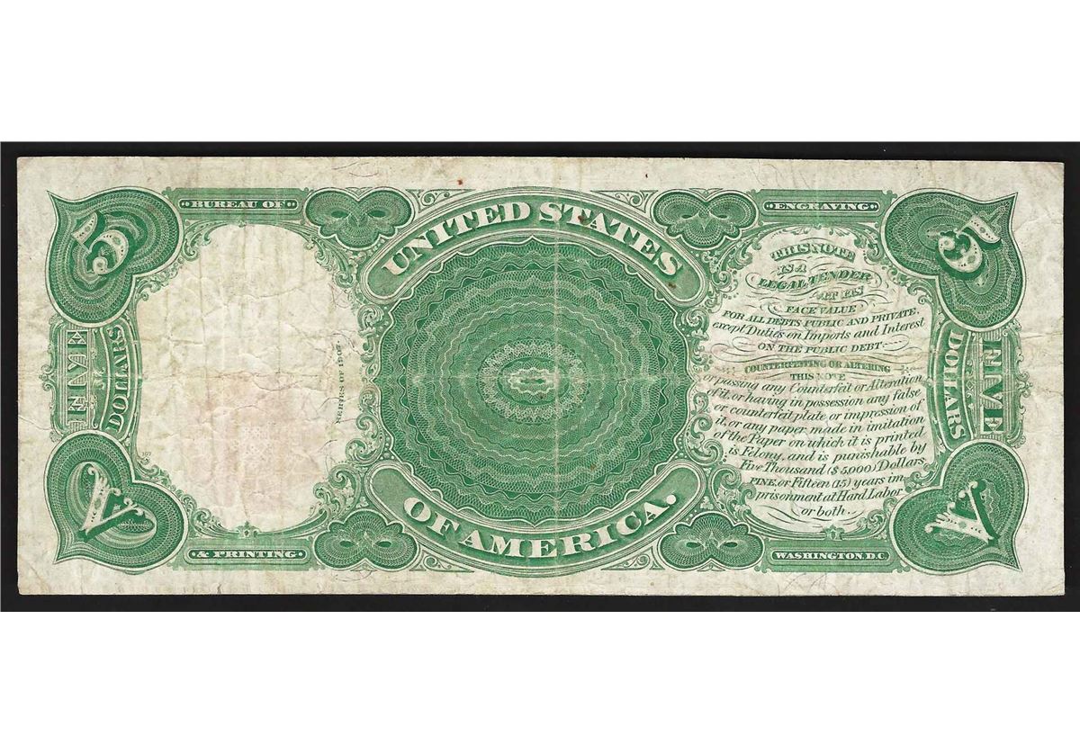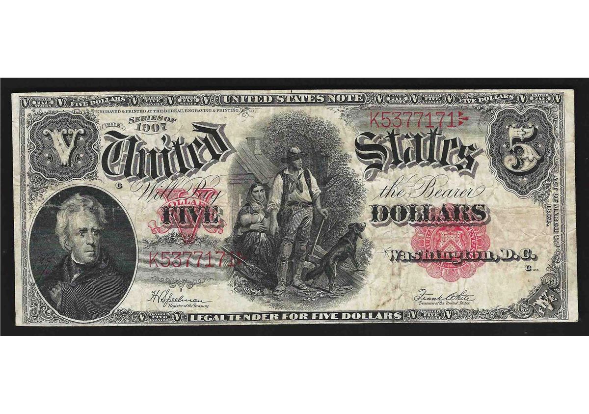 One 1907 $5 Large Size Woodchopper Legal Tender Note.