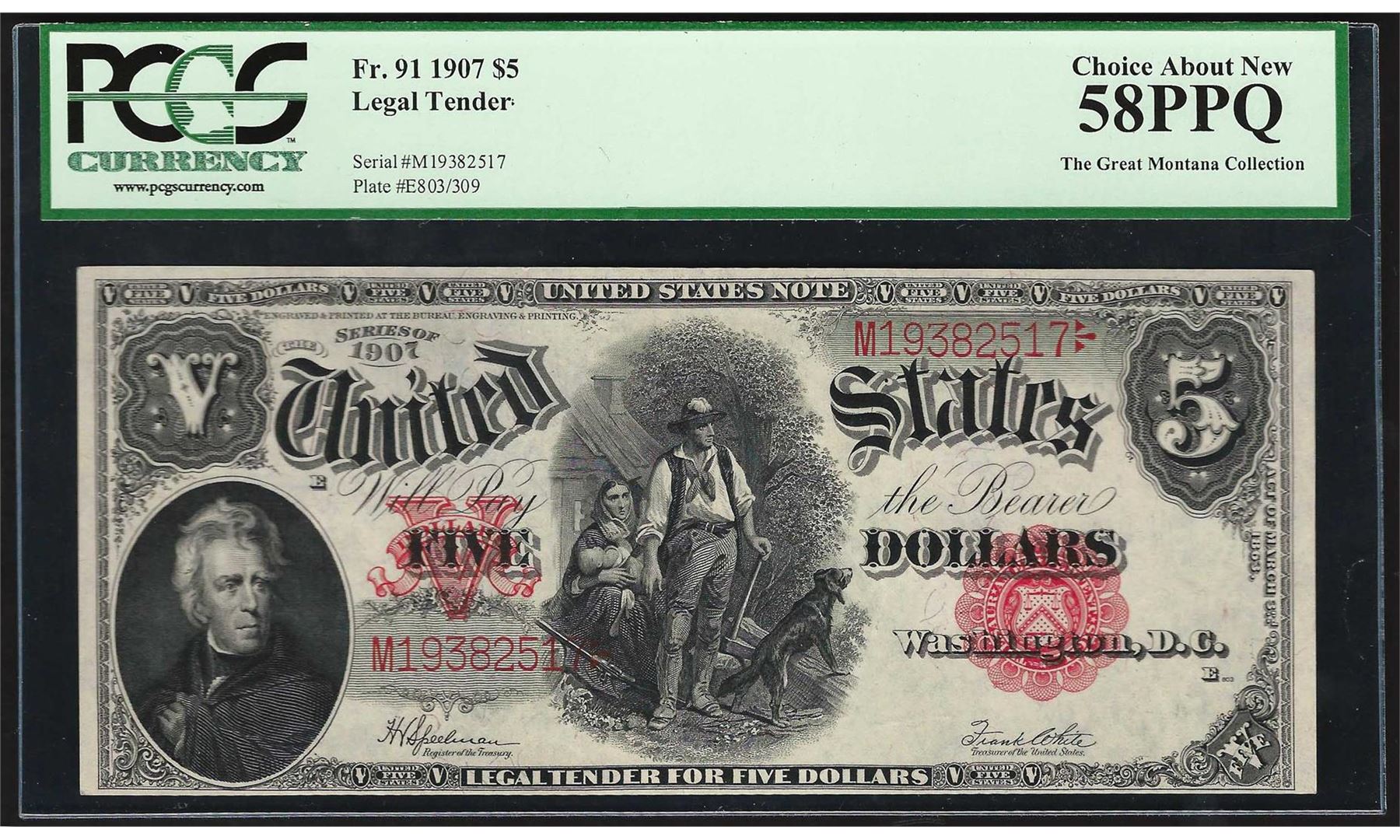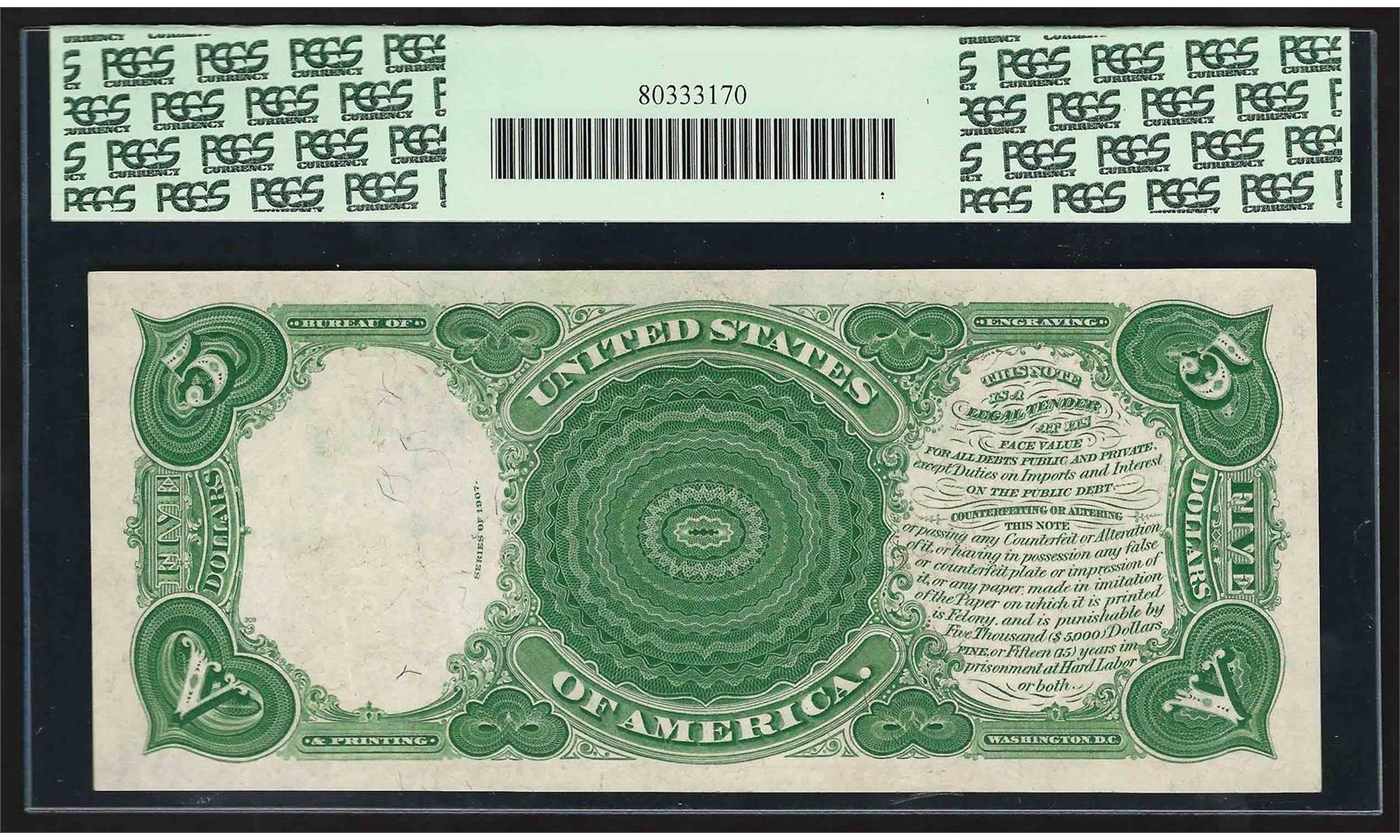 One 1907 $5 Legal Tender Woodchopper Note PCGS Choice About New 58PPQ. PCGS Graded.