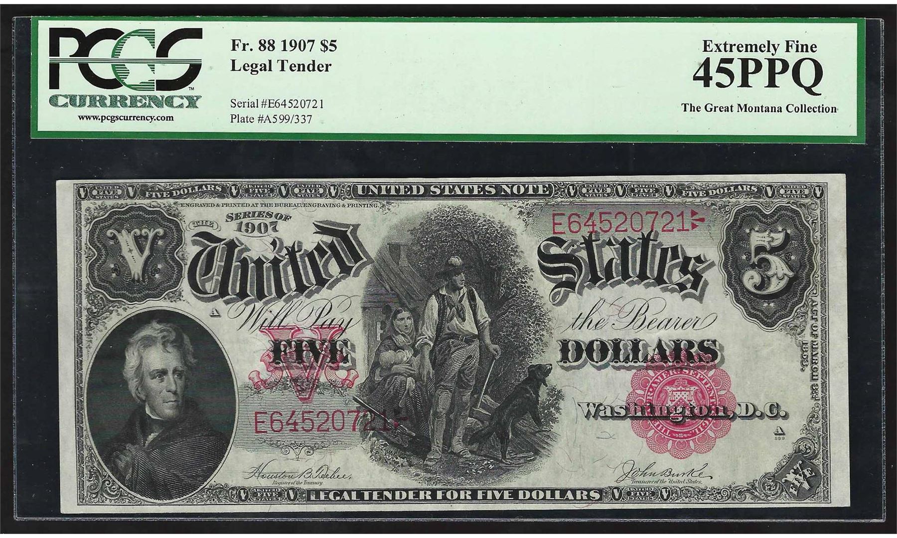 One 1907 $5 Legal Tender Woodchopper Note PCGS Extremely Fine 45PPQ. PCGS Graded.