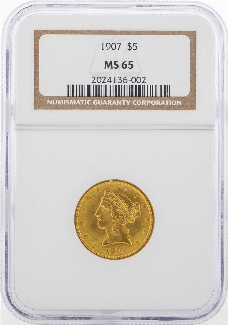 One 1907 $5 Liberty Head Half Eagle Gold Coin NGC MS65. NGC Certified.