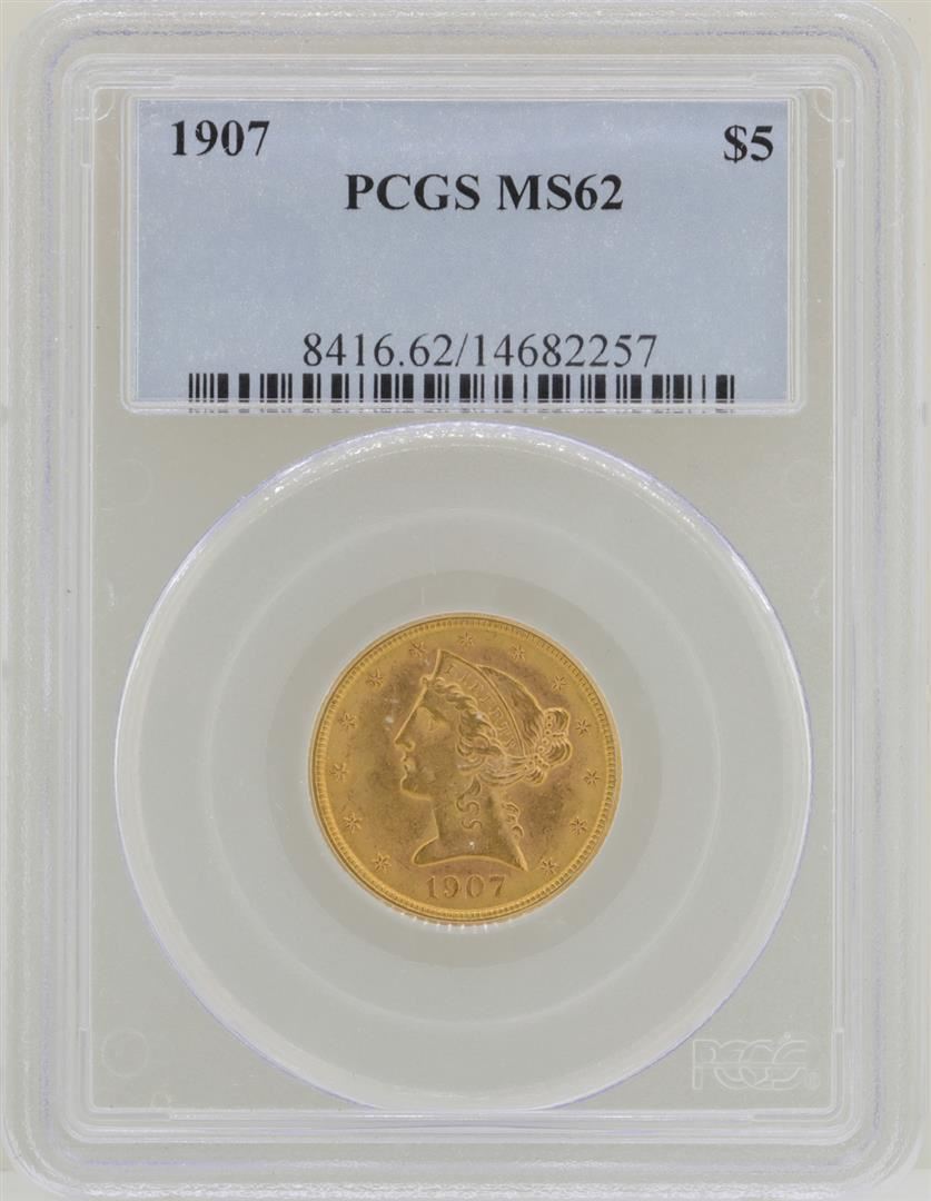One 1907 $5 Liberty Head Half Eagle Gold Coin PCGS MS62. PCGS Graded.