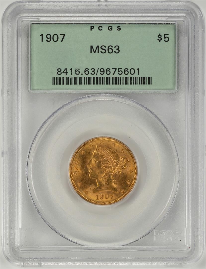 1907 $5 Liberty Head Half Eagle Gold Coin PCGS MS63 Old Green Holder