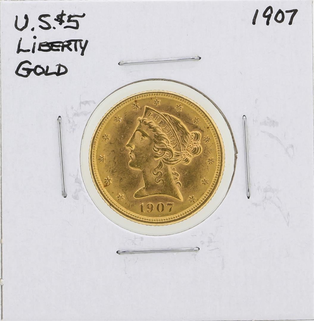 One 1907 $5 Liberty Head Half Eagle Gold Coin.