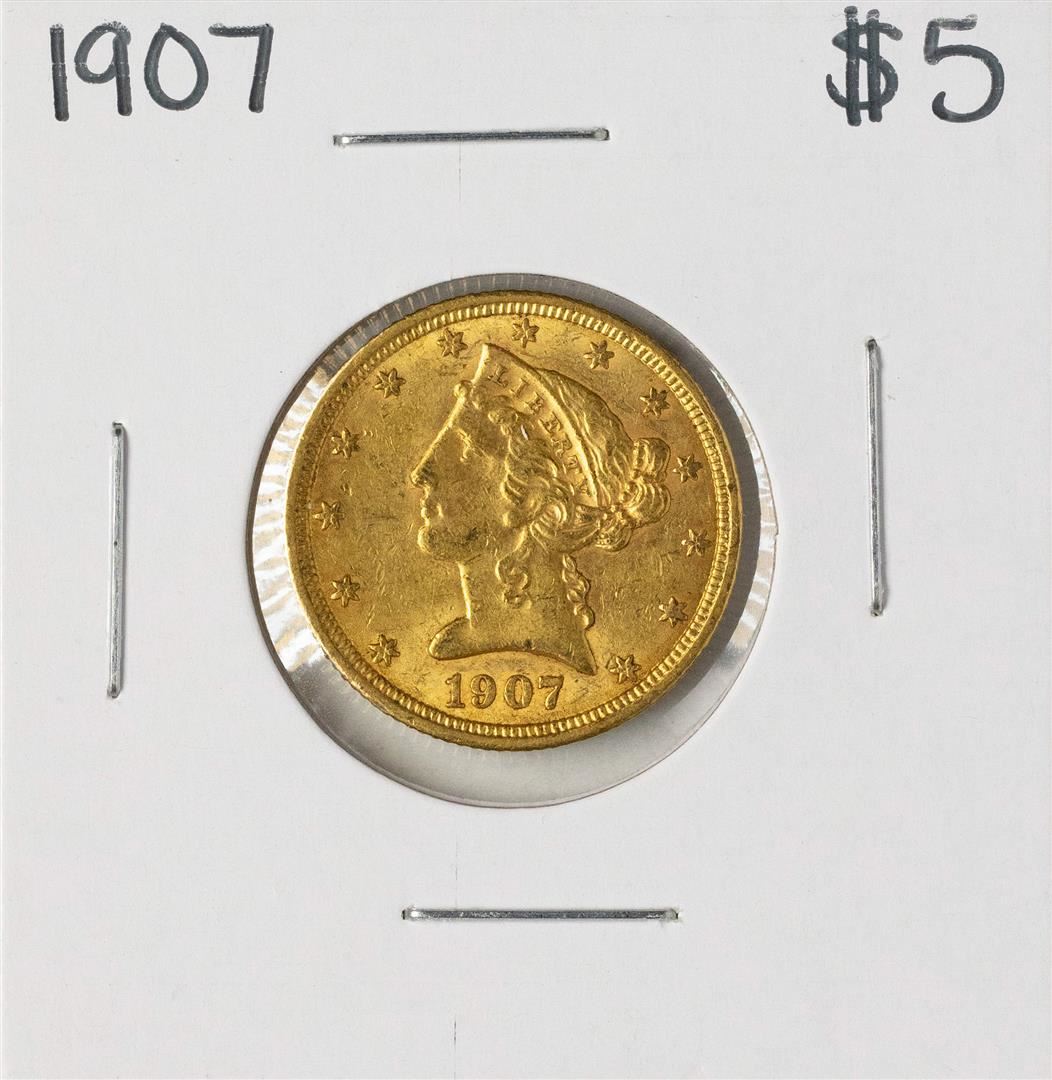 One 1907 $5 Liberty Head Half Eagle Gold Coin.