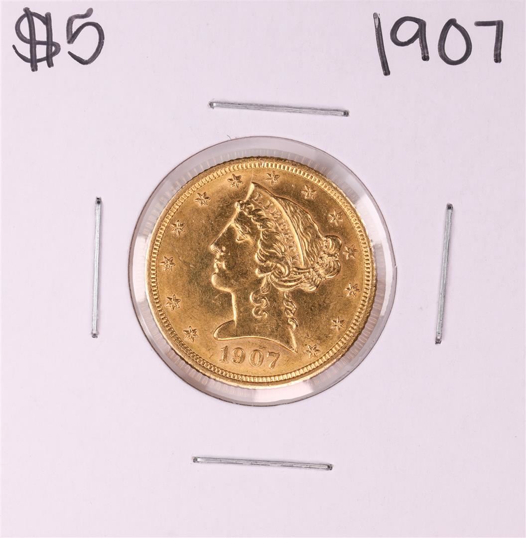 One 1907 $5 Liberty Head Half Eagle Gold Coin.