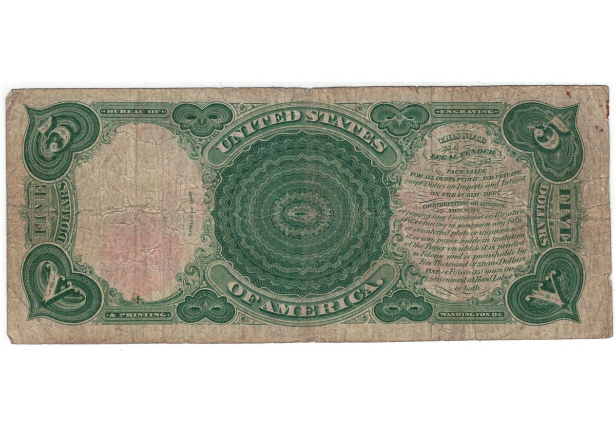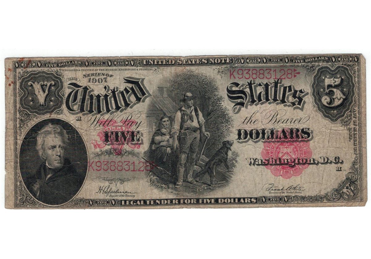 One 1907 $5 Woodchopper Legal Tender Bank Note.