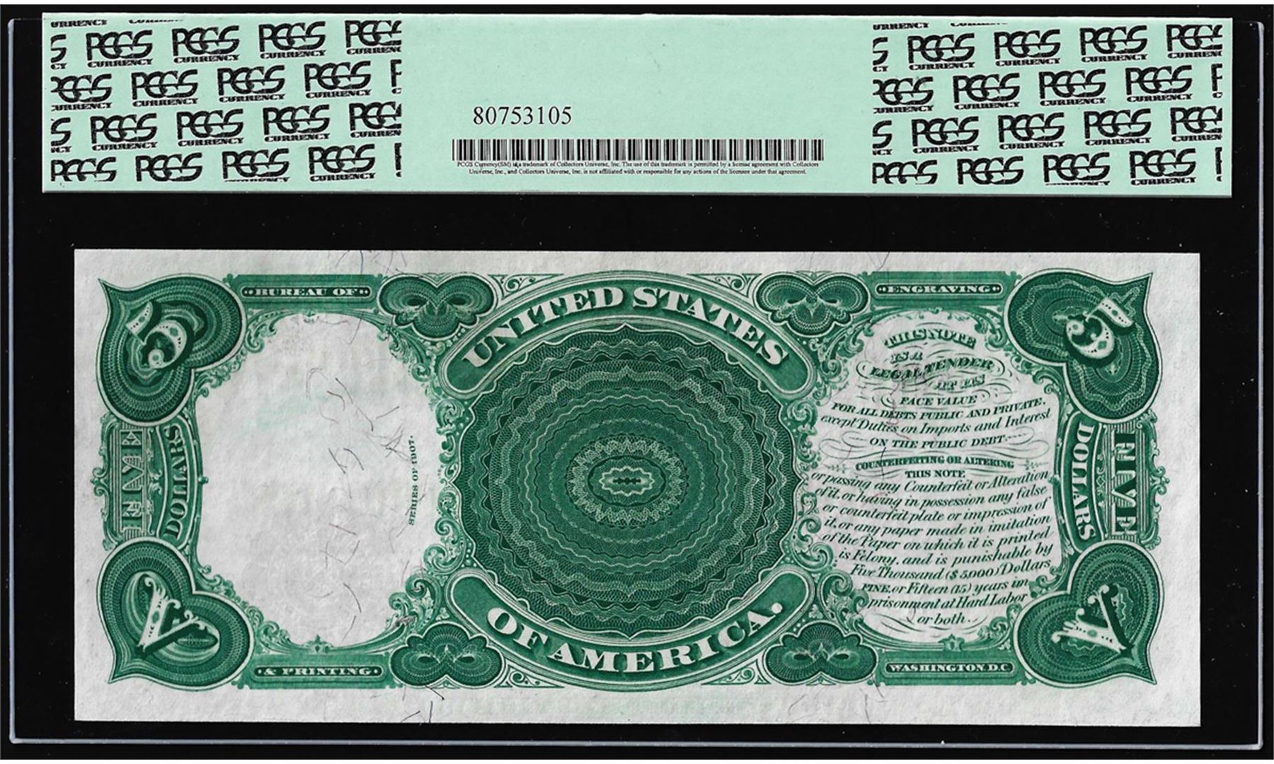 One 1907 $5 Woodchopper Legal Tender Note Fr.88 PCGS Choice New 63PPQ. PCGS Graded.