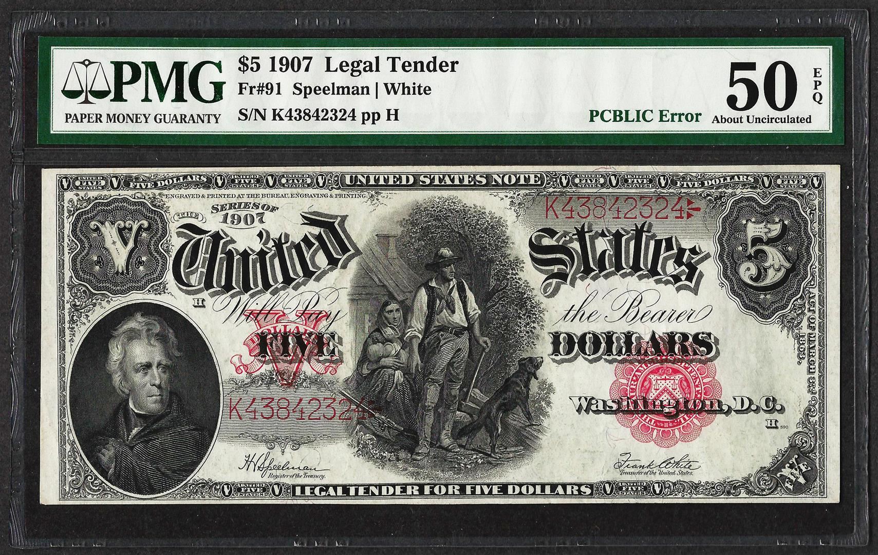 One 1907 $5 Woodchopper Legal Tender Note Fr.91 PMG About Uncirculated 50EPQ PCBLIC Error. PMG Certified.