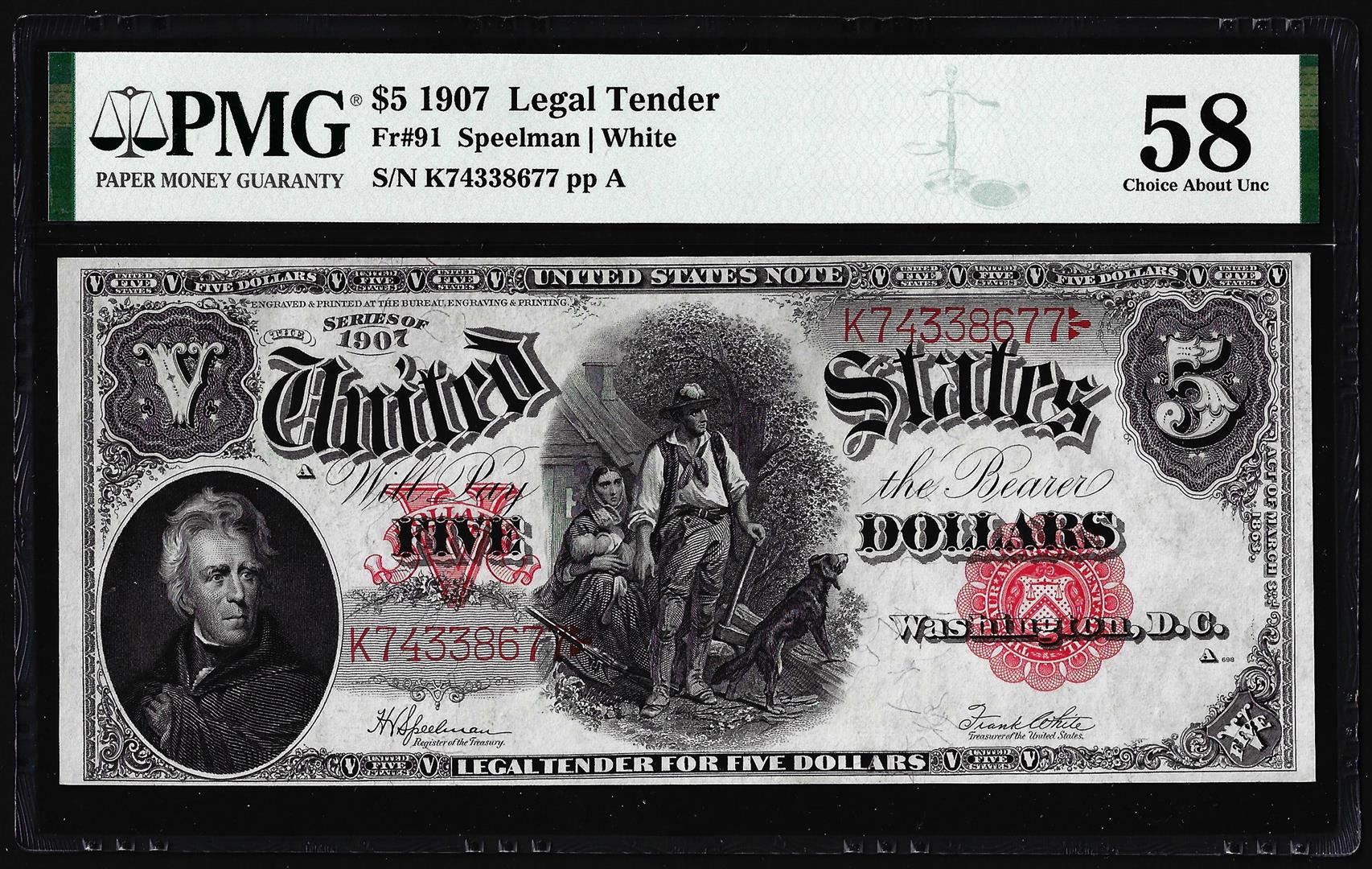 One 1907 $5 Woodchopper Legal Tender Note Fr.91 PMG Choice About Uncirculated 58. PMG Certified.
