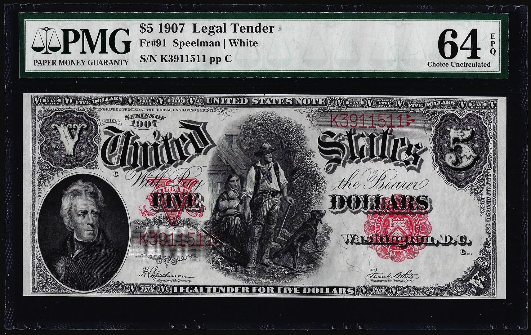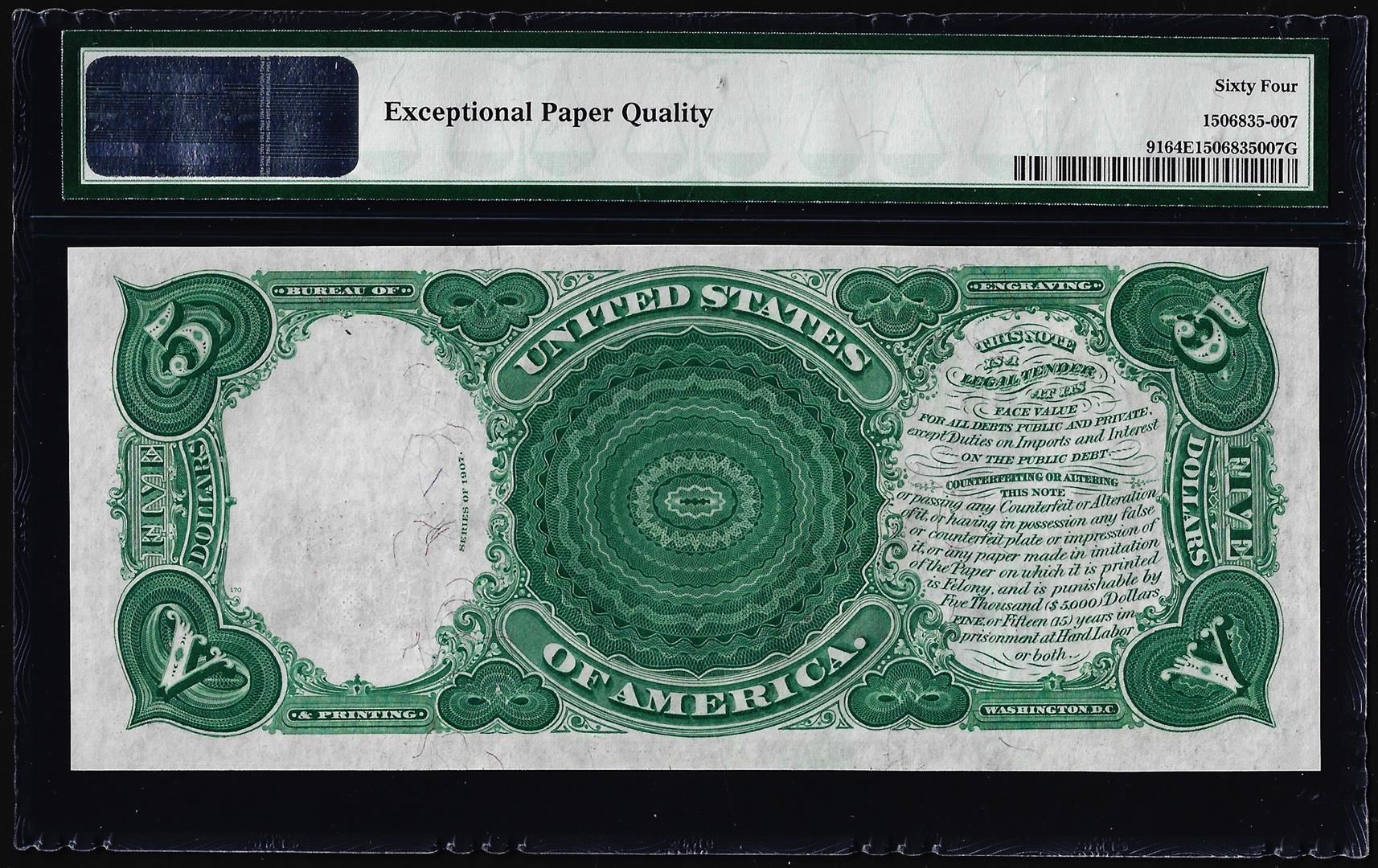 One 1907 $5 Woodchopper Legal Tender Note Fr.91 PMG Choice Uncirculated 64EPQ. PMG Certified.