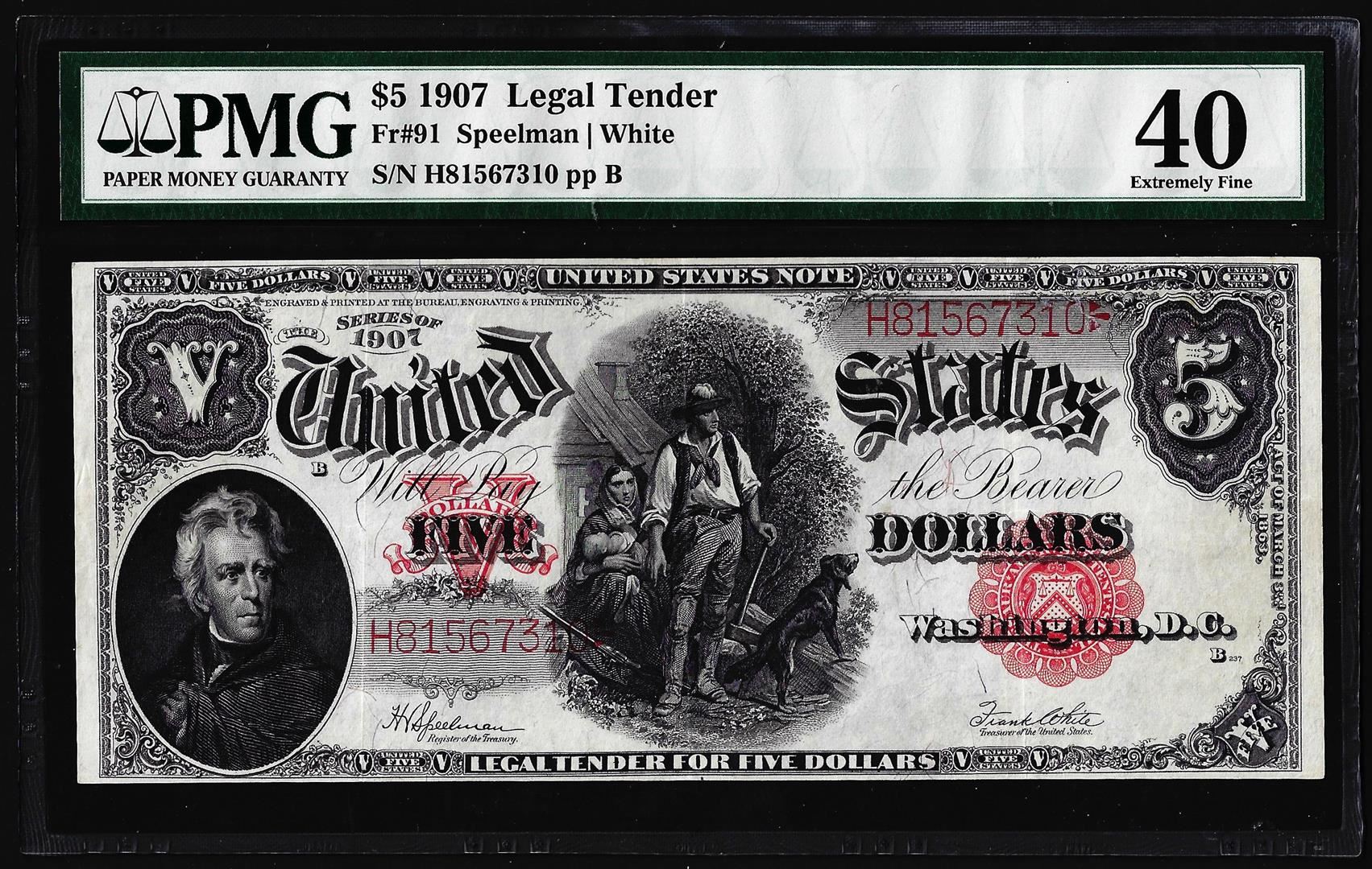 One 1907 $5 Woodchopper Legal Tender Note Fr.91 PMG Extremely Fine 40. PMG Certified.