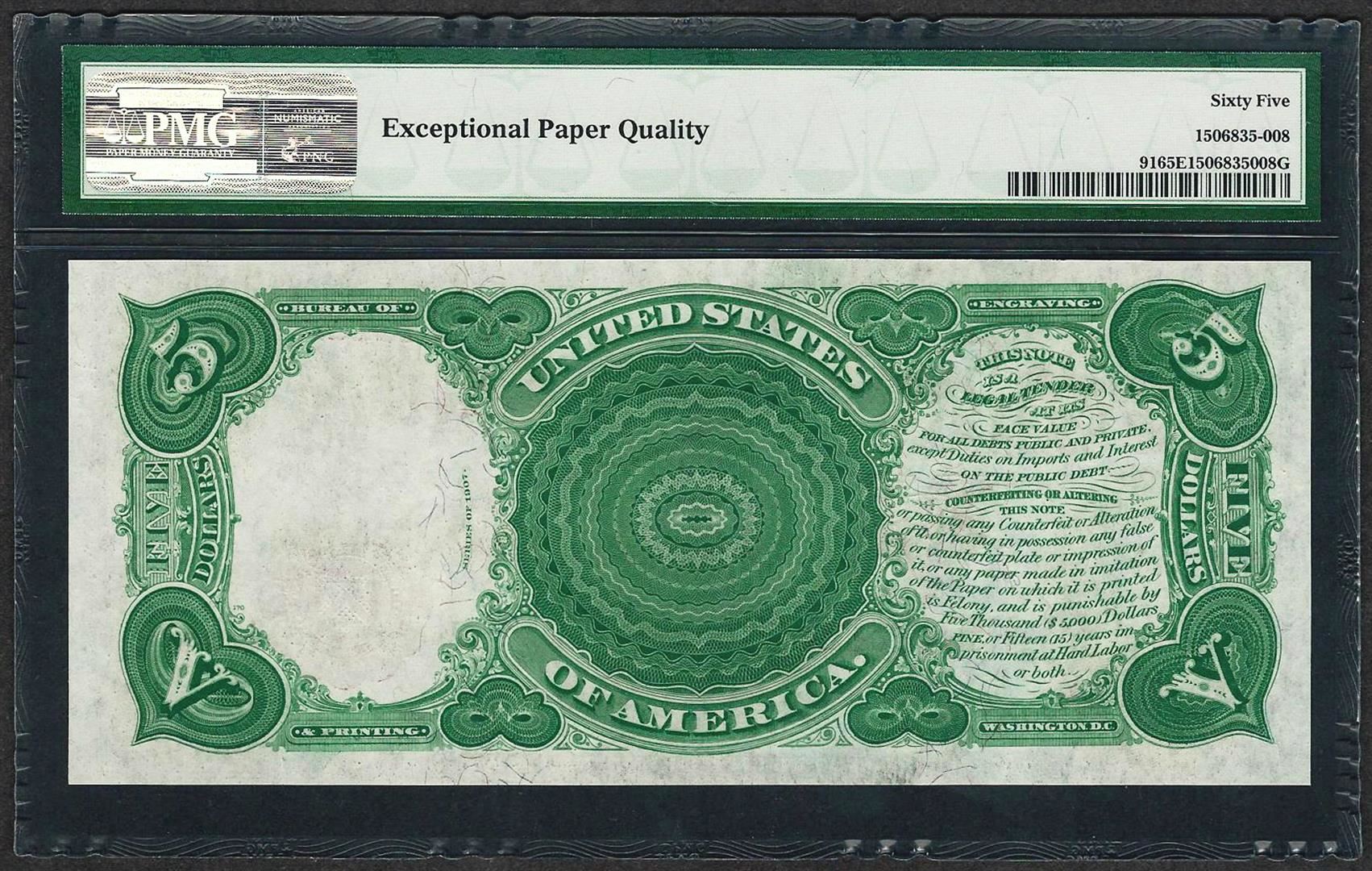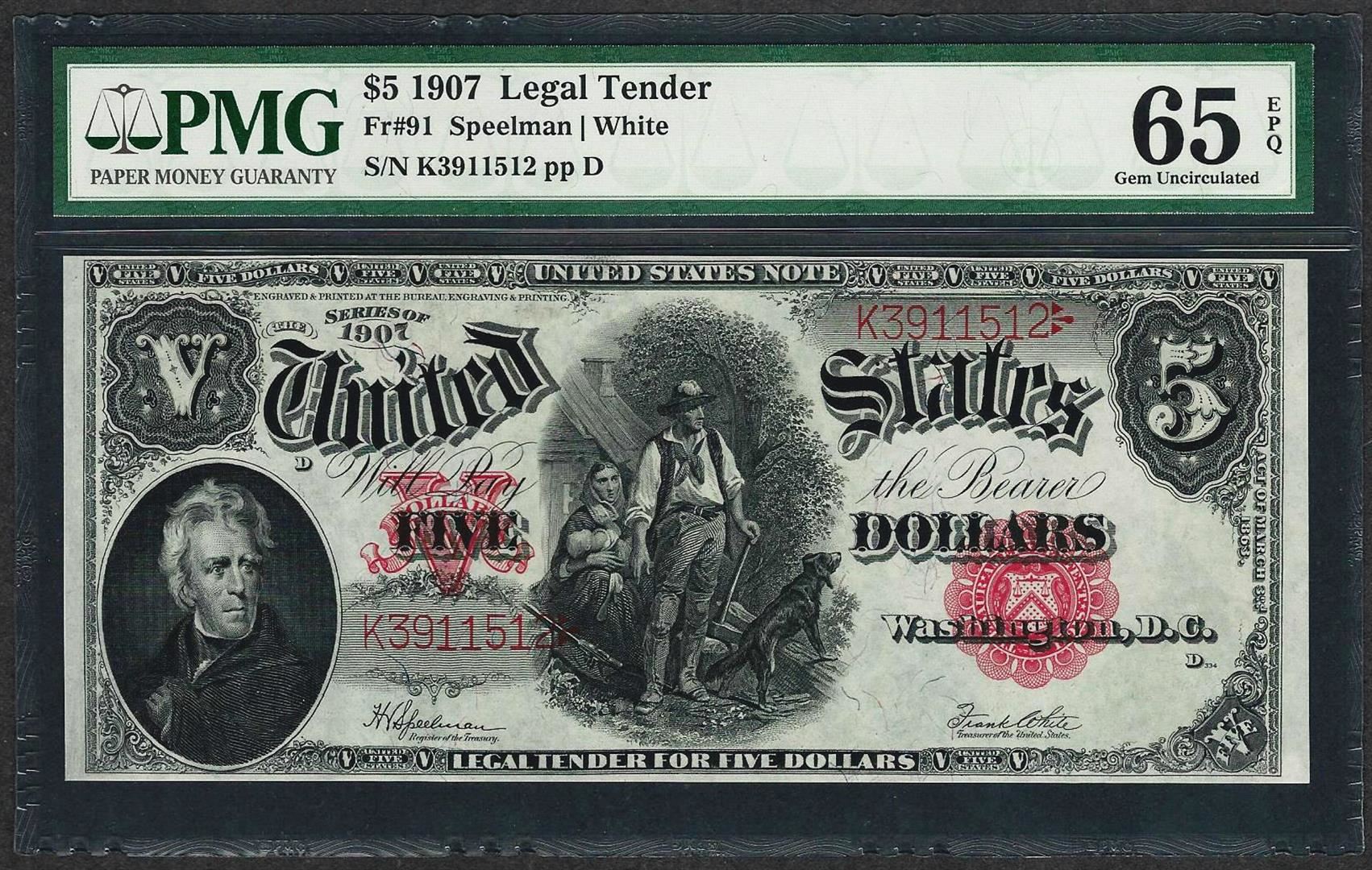 One 1907 $5 Woodchopper Legal Tender Note Fr.91 PMG Gem Uncirculated 65EPQ. PMG Certified.