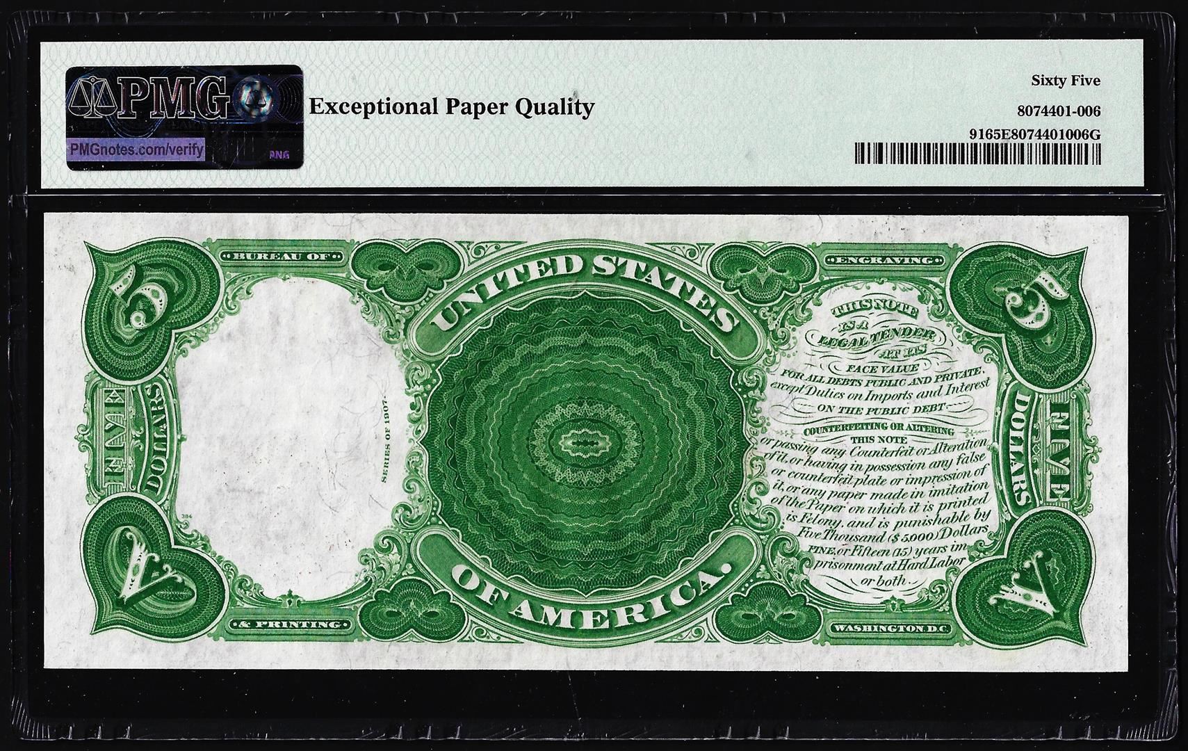 One 1907 $5 Woodchopper Legal Tender Note Fr.91 PMG Gem Uncirculated 65EPQ. PMG Certified.