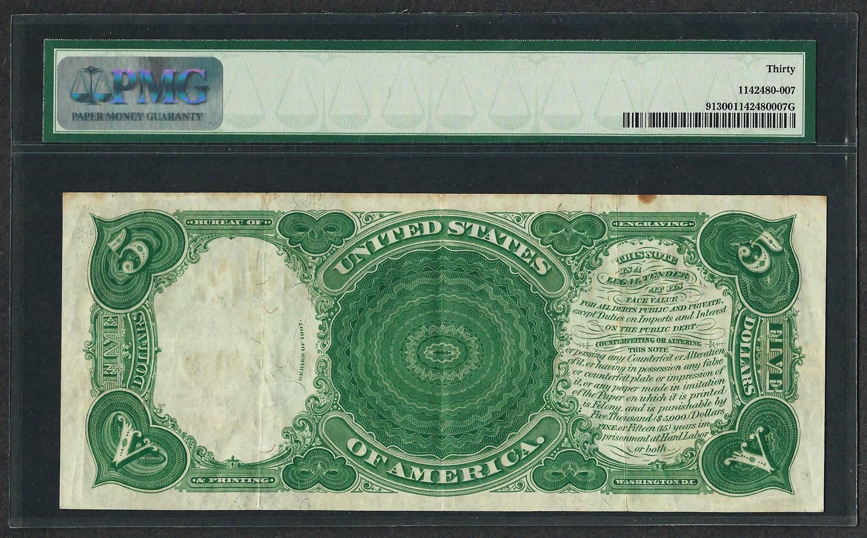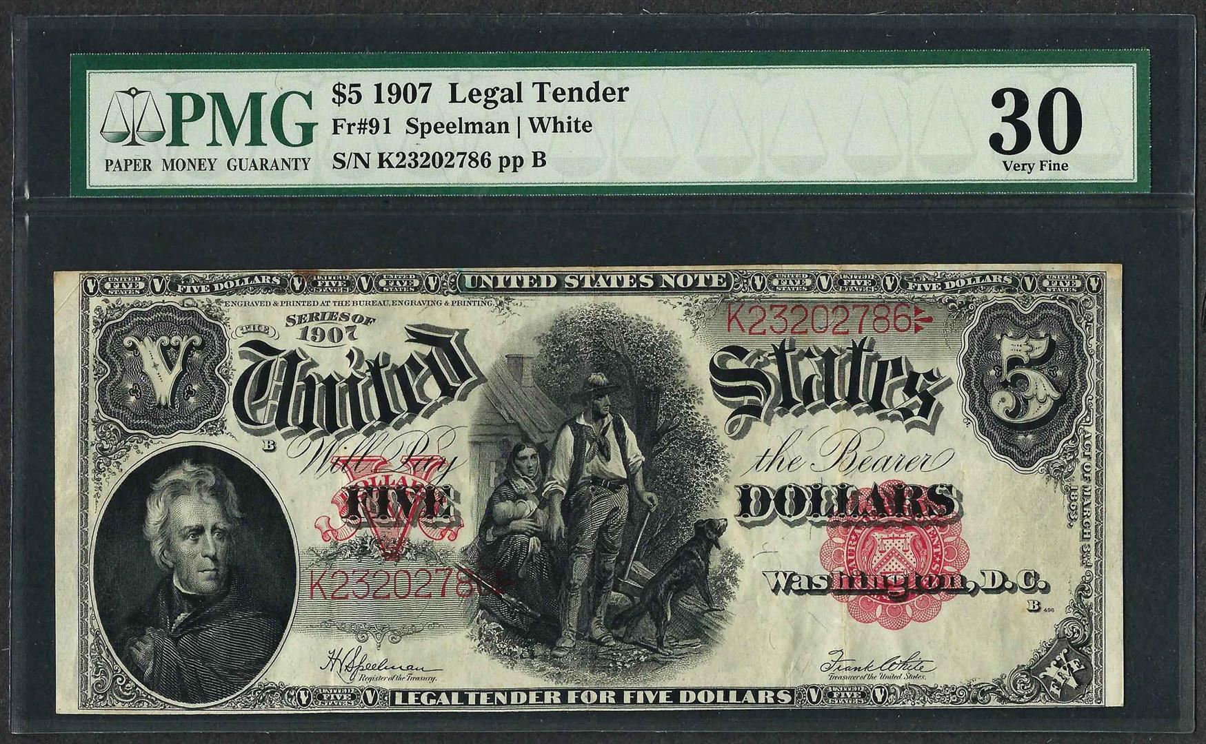 One 1907 $5 Woodchopper Legal Tender Note Fr.91 PMG Very Fine 30. PMG Certified.