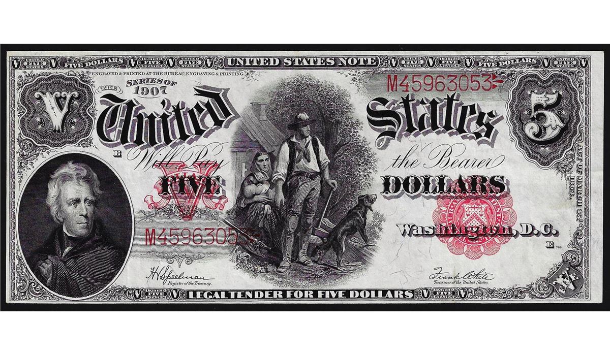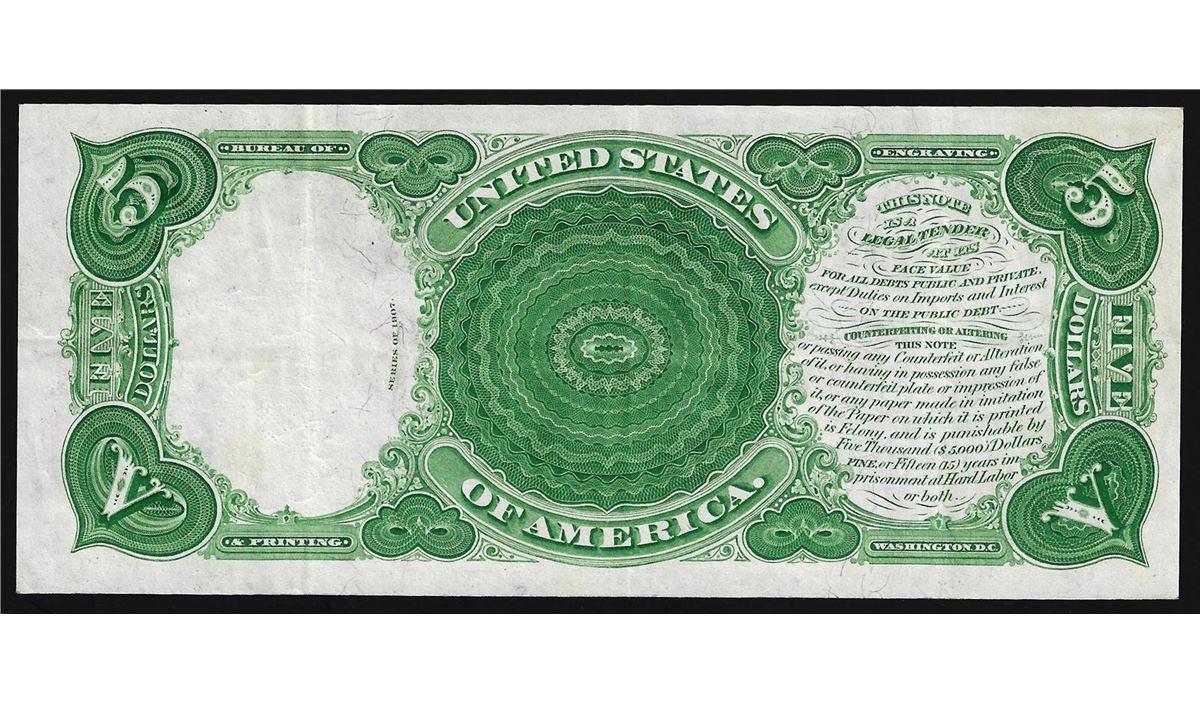 One 1907 $5 Woodchopper Legal Tender Note PCBLIC ERROR.