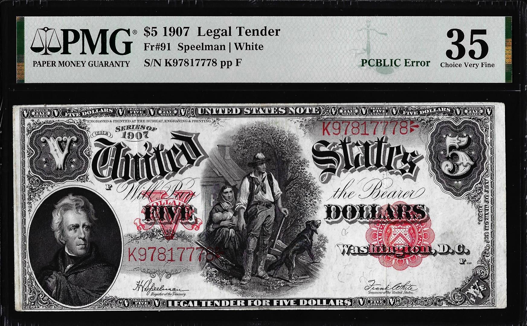 One 1907 $5 Woodchopper Legal Tender Note PCBLIC Error Fr.91 PMG Choice Very Fine 35. PMG Certified.