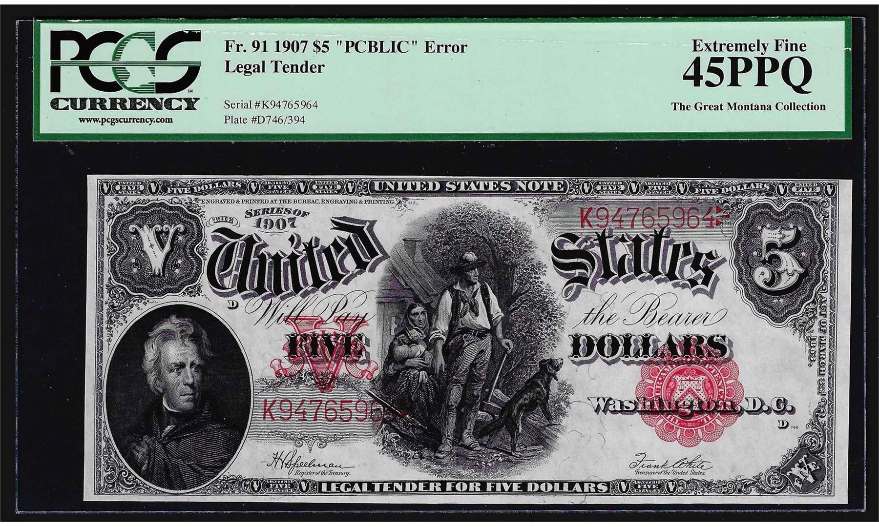 One 1907 $5 Woodchopper Legal Tender Note PCGS XF45PPQ PCBLIC ERROR. PCGS Graded.