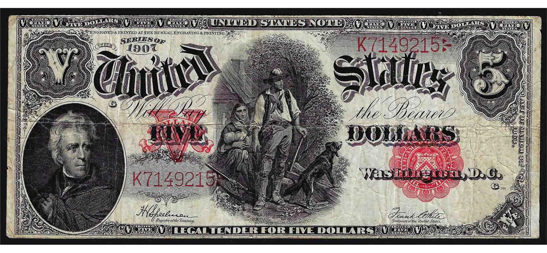 One 1907 $5 Woodchopper Legal Tender Note.