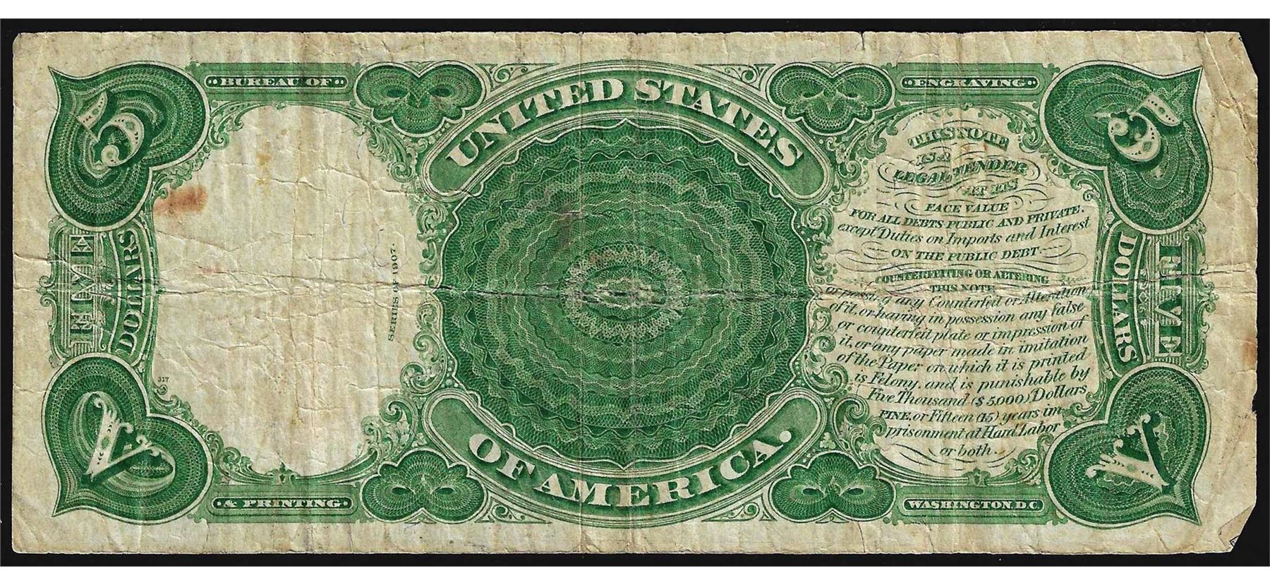 One 1907 $5 Woodchopper Legal Tender Note.