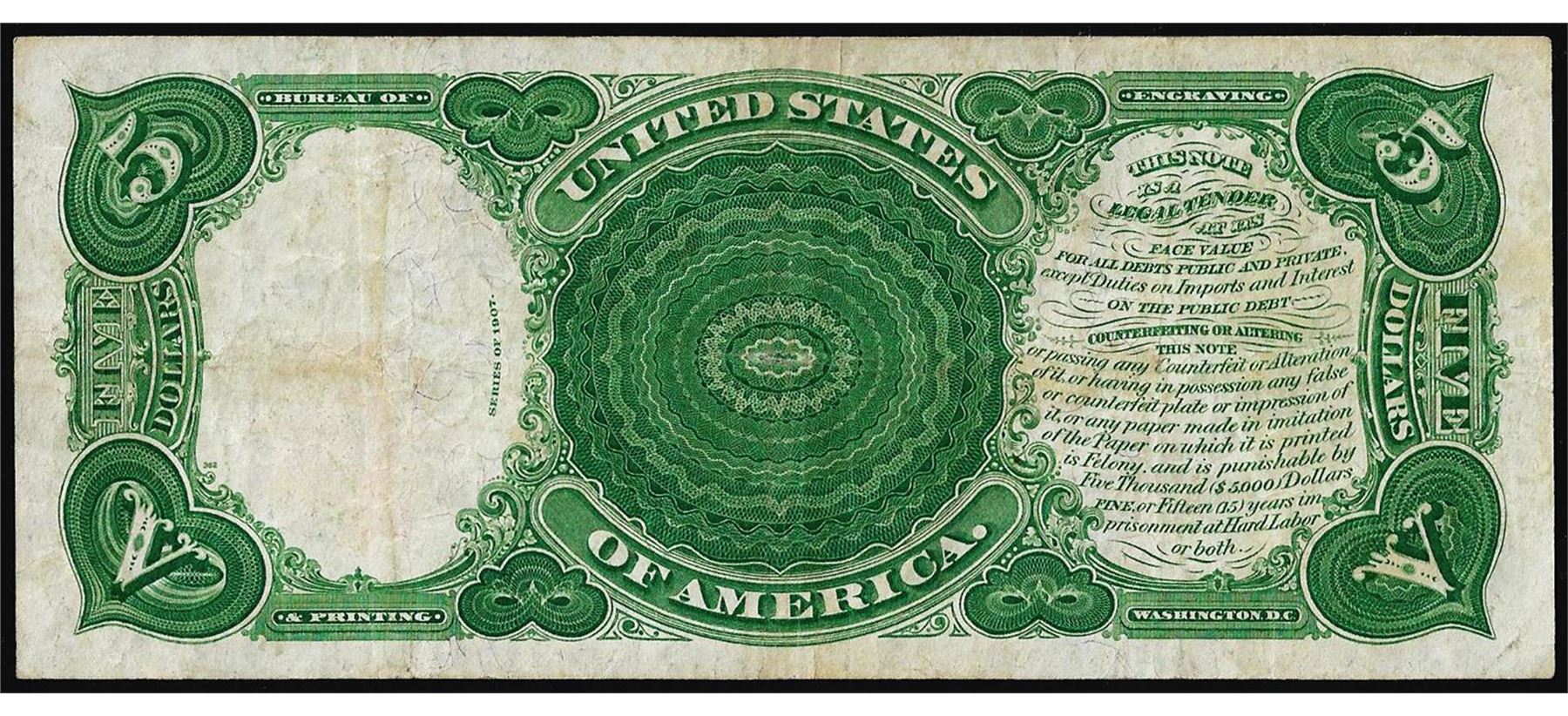 One 1907 $5 Woodchopper Legal Tender Note.