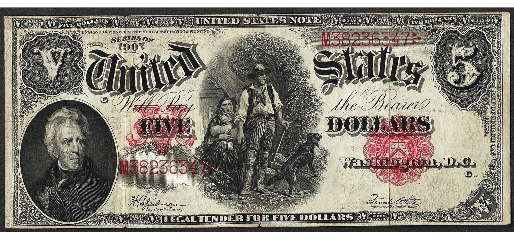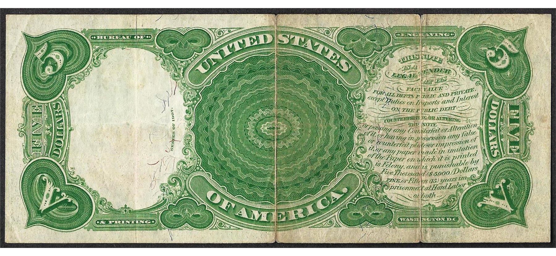 One 1907 $5 Woodchopper Legal Tender Note.
