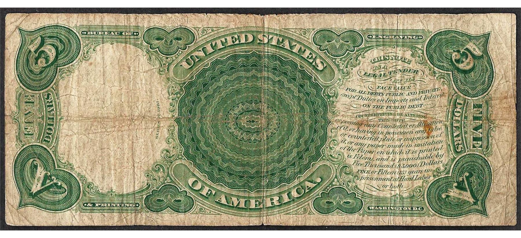 One 1907 $5 Woodchopper Legal Tender Note.