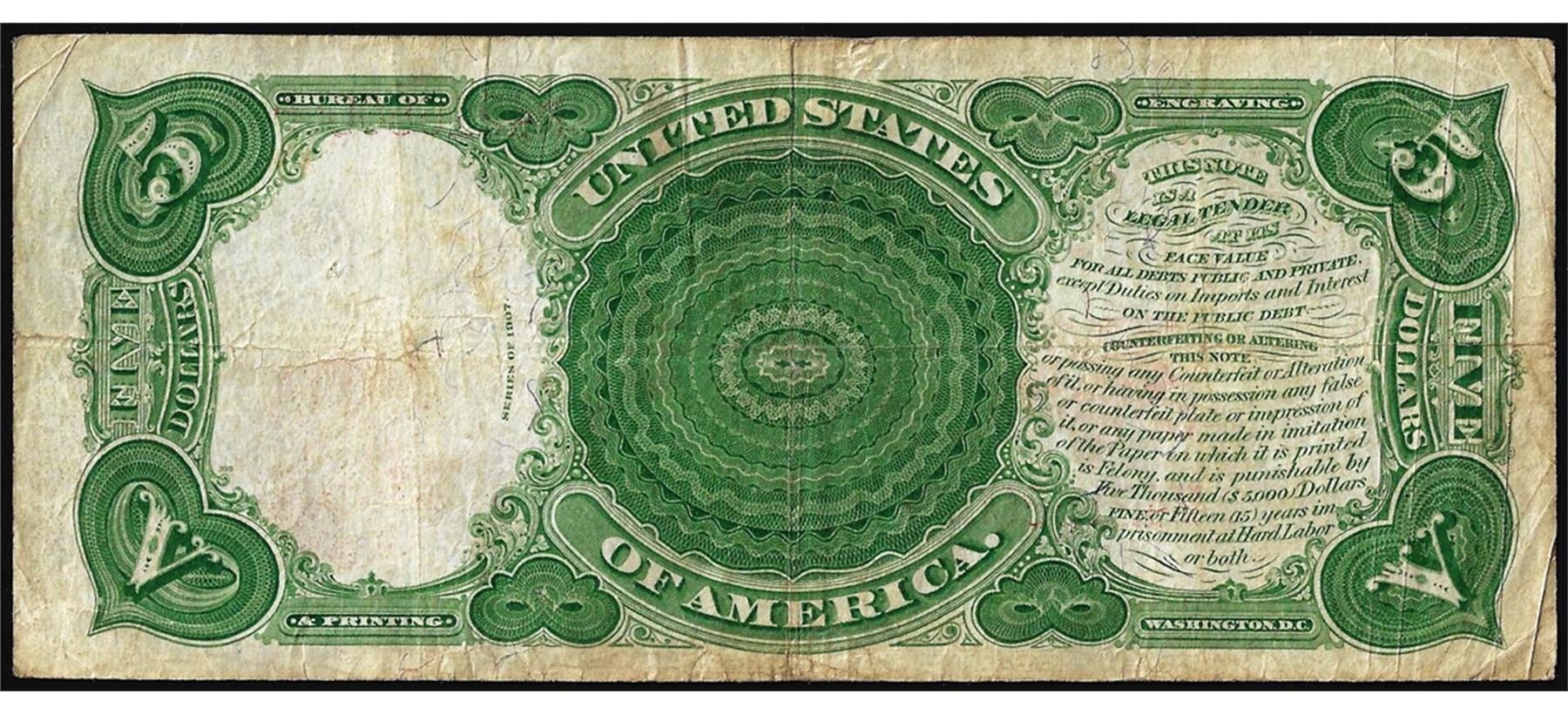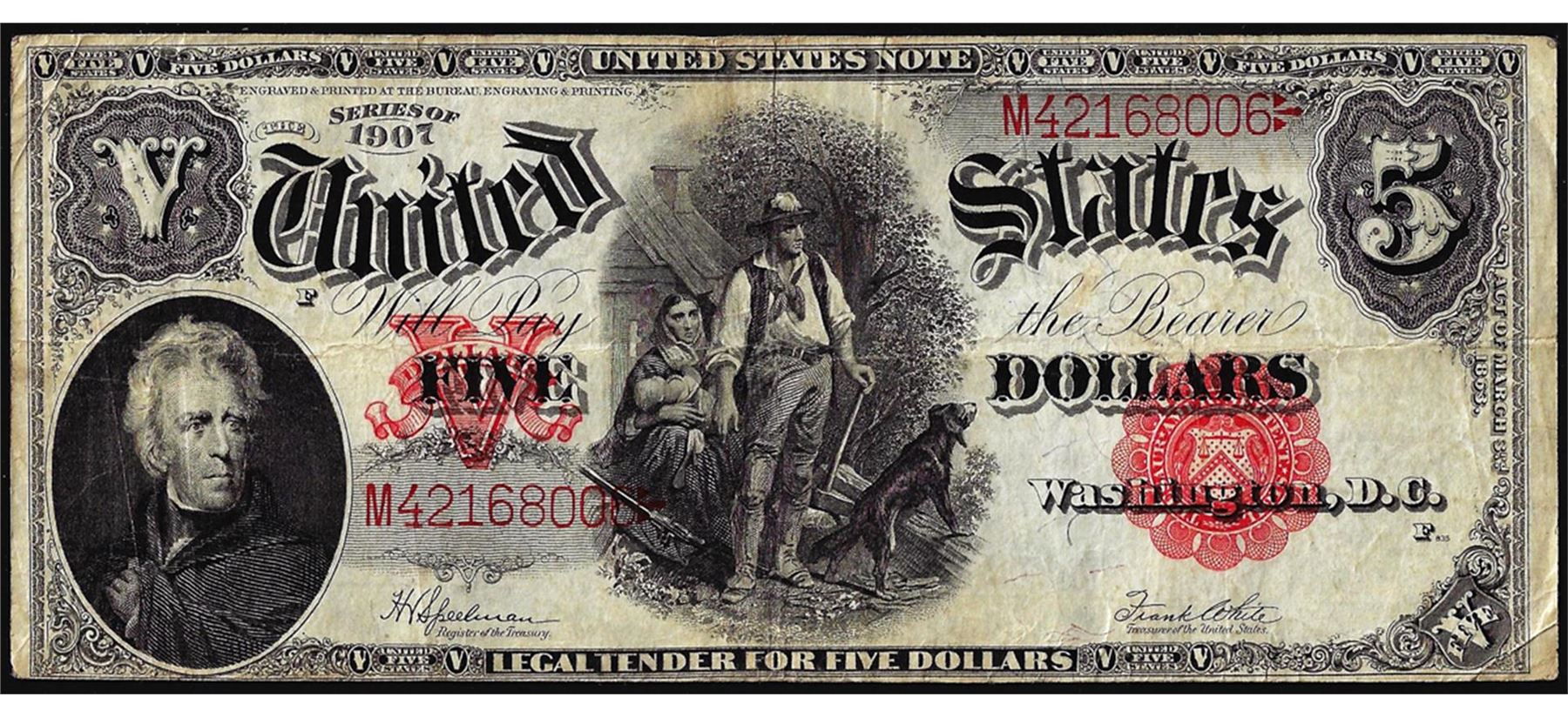 One 1907 $5 Woodchopper Legal Tender Note.