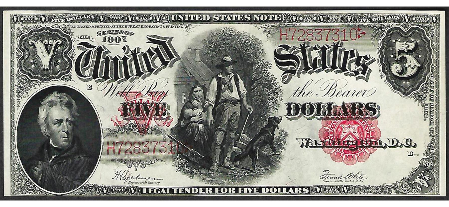 One 1907 $5 Woodchopper Legal Tender Note.