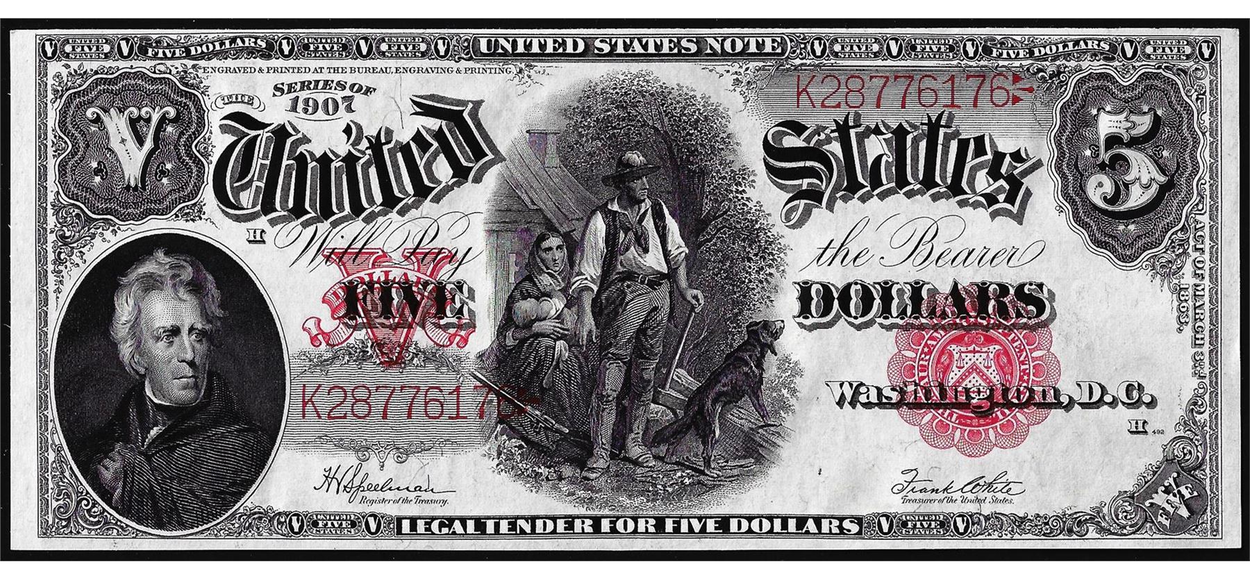 One 1907 $5 Woodchopper Legal Tender Note.