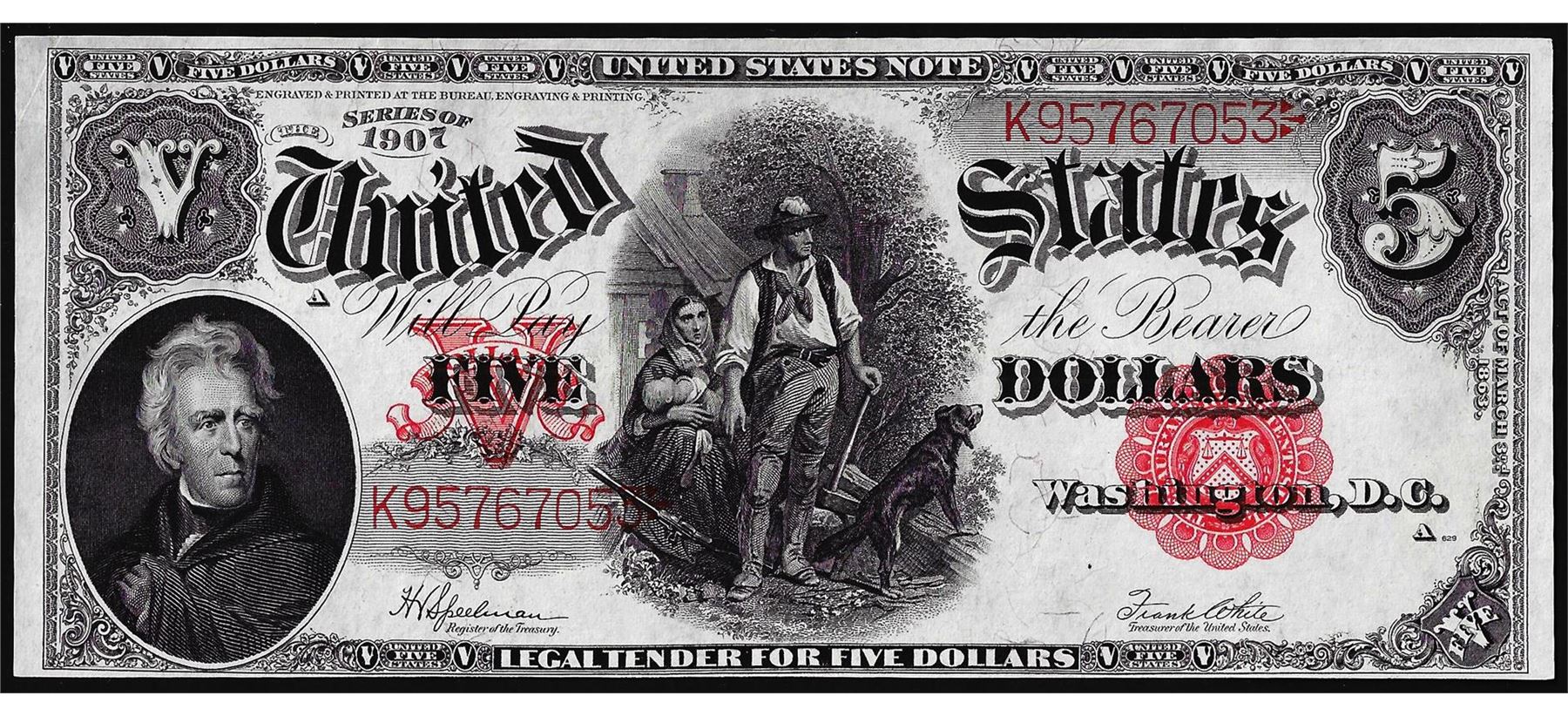 One 1907 $5 Woodchopper Legal Tender Note.