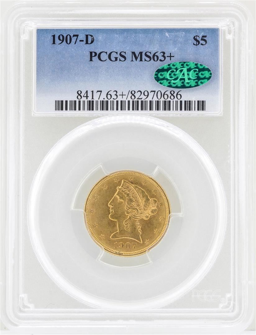 One 1907-D $5 Liberty Head Half Eagle Gold Coin PCGS MS63+ CAC. PCGS Graded.