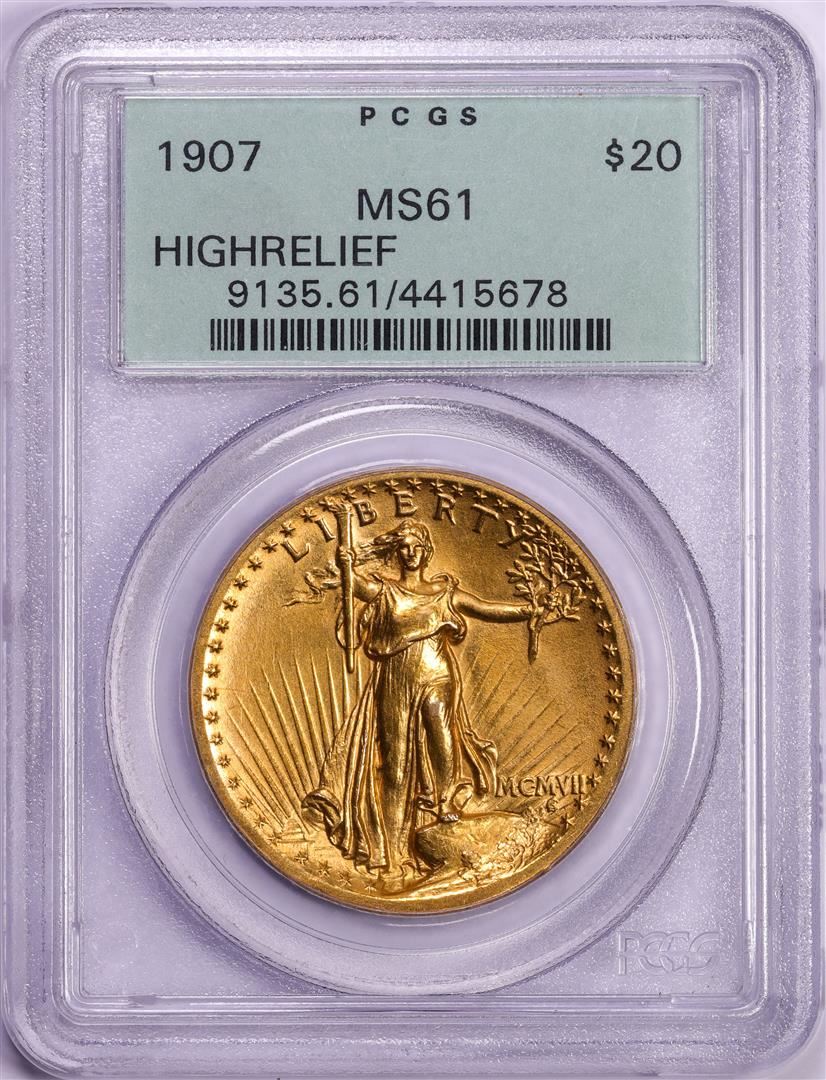 One 1907 High Relief $20 St. Gaudens Double Eagle Gold Coin PCGS MS61 Old Green Holder. PCGS Graded.