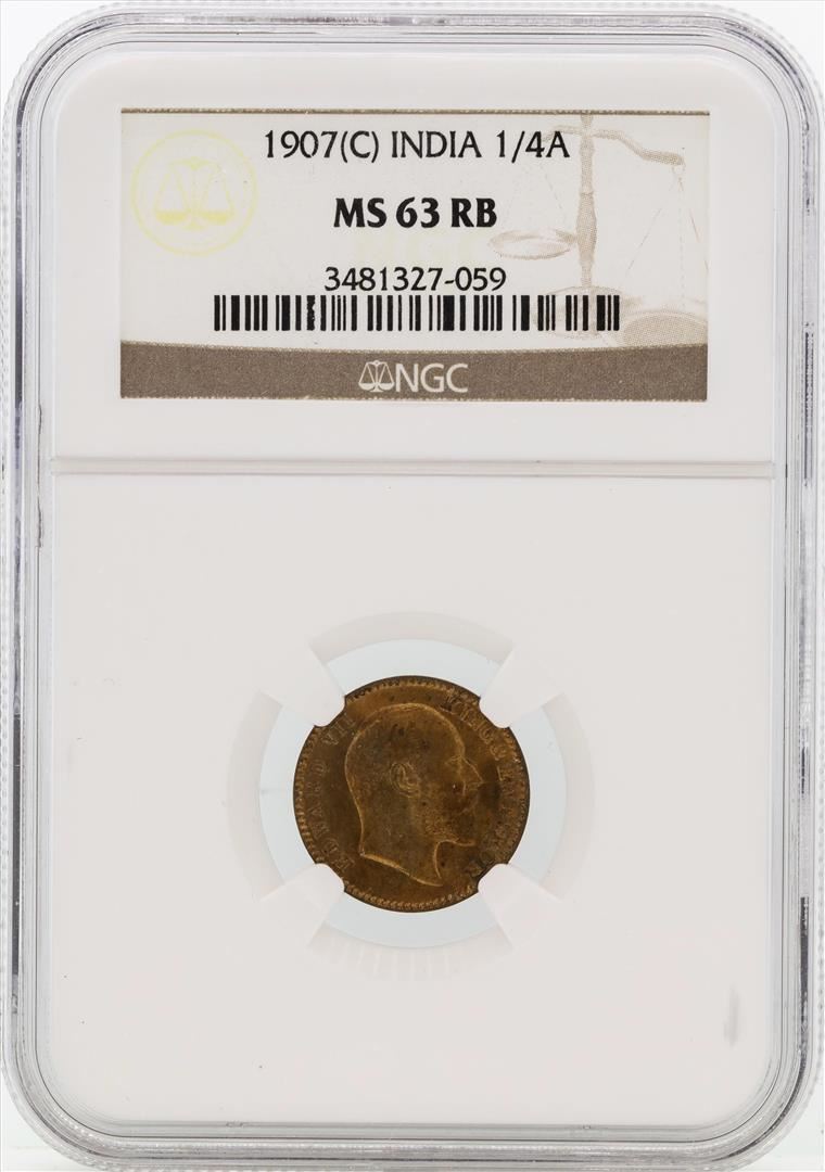 One 1907 India 1/4 Annas Coin NGC MS63RB. NGC Certified.