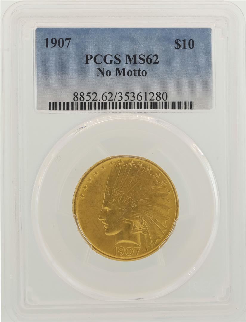 One 1907 No Motto $10 Indian Head Eagle Gold Coin PCGS MS62. PCGS Graded.