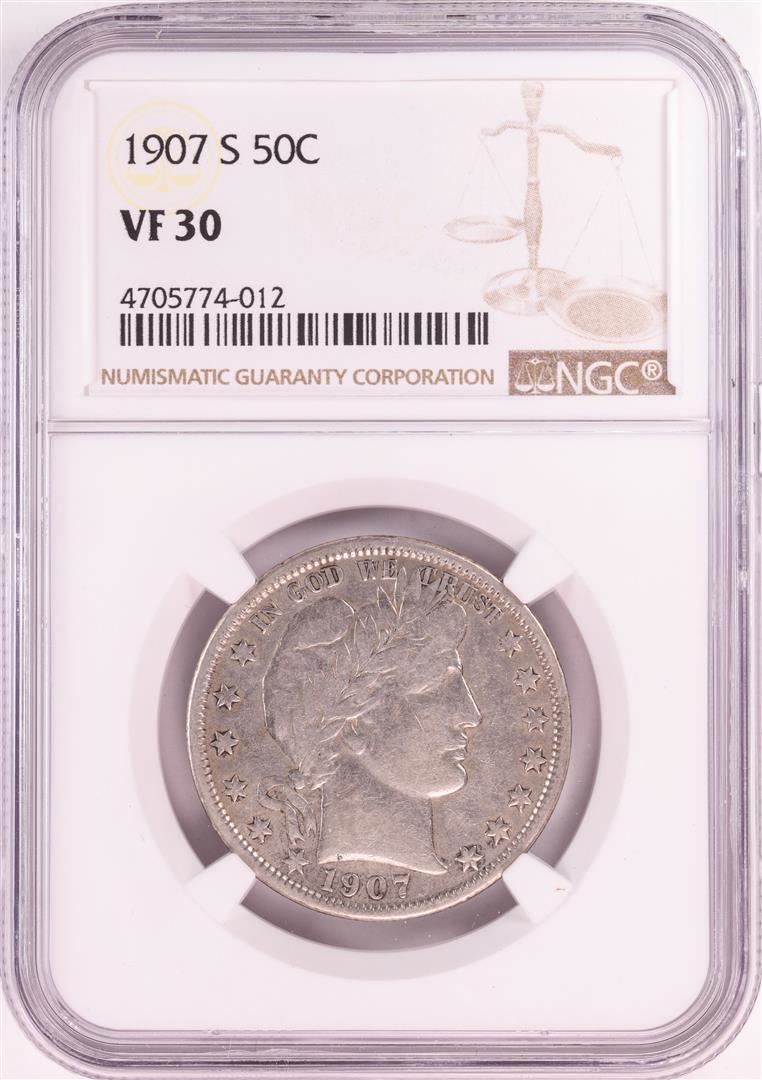 One 1907-S Barber Half Dollar Coin NGC VF30. NGC Certified.