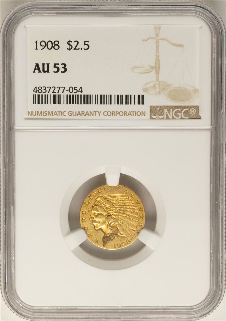 One 1908 $2 1/2 Indian Head Quarter Eagle Gold Coin AU53.