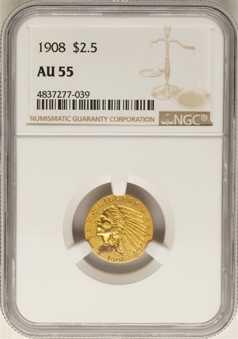One 1908 $2 1/2 Indian Head Quarter Eagle Gold Coin AU55.