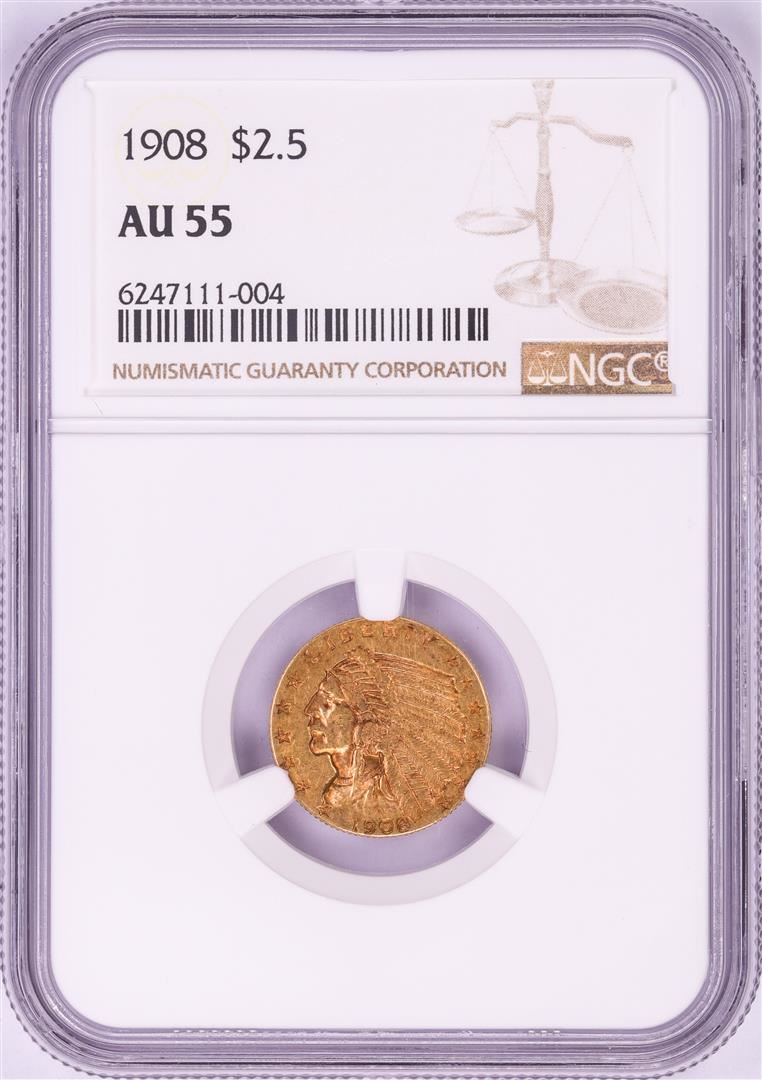 One 1908 $2 1/2 Indian Head Quarter Eagle Gold Coin NGC AU55. NGC Certified.