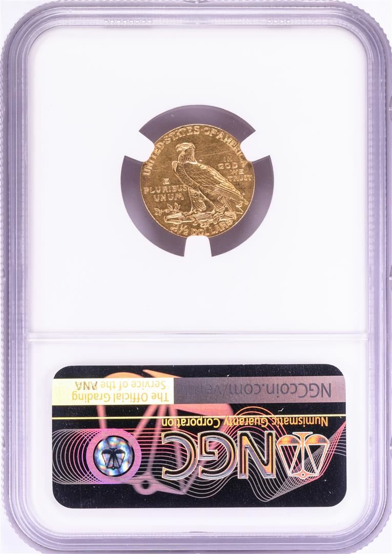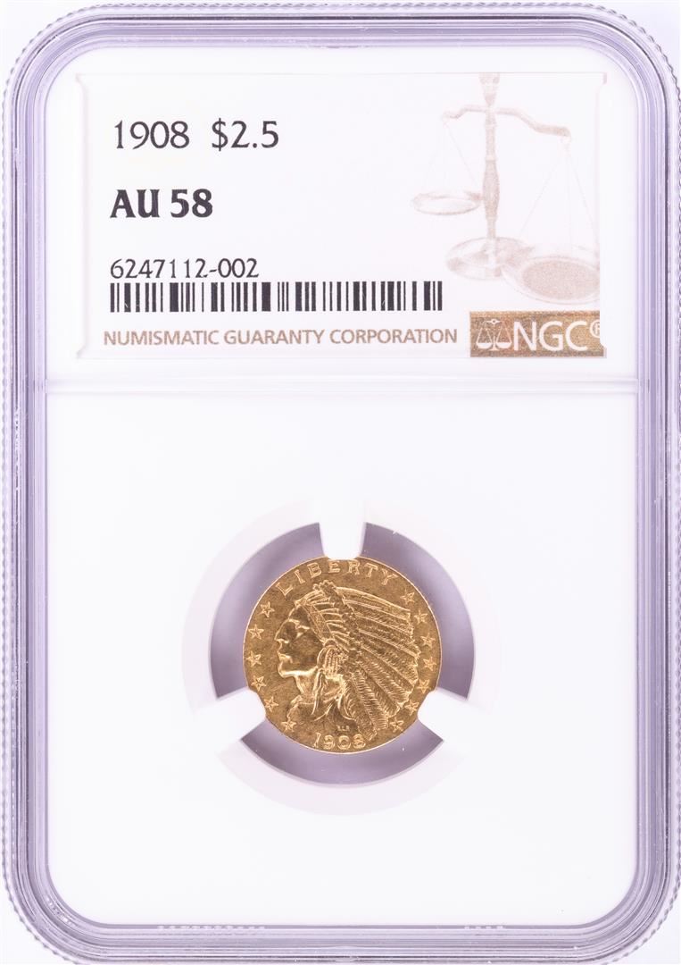 One 1908 $2 1/2 Indian Head Quarter Eagle Gold Coin NGC AU58. NGC Certified.