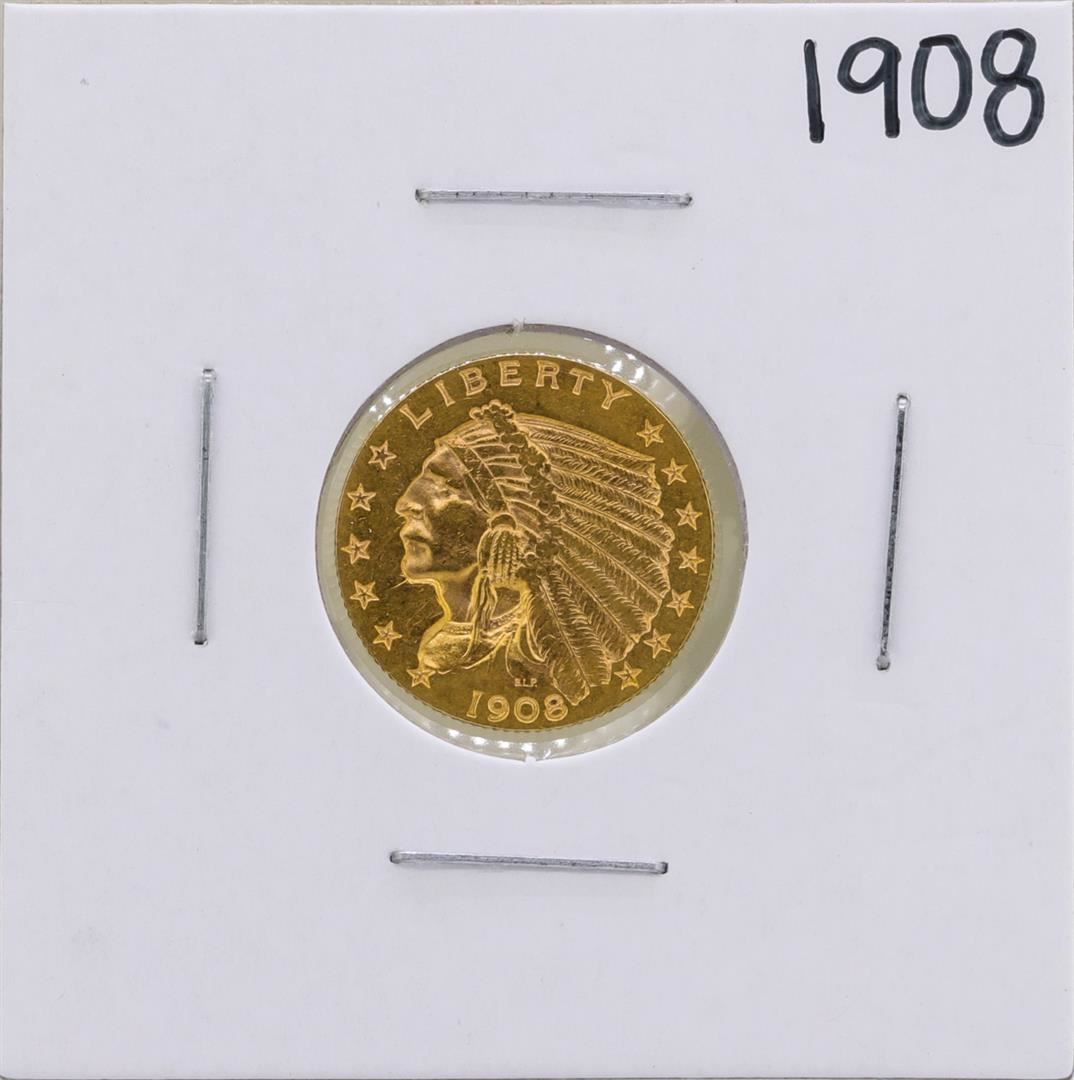 One 1908 $2 1/2 Indian Head Quarter Eagle Gold Coin.