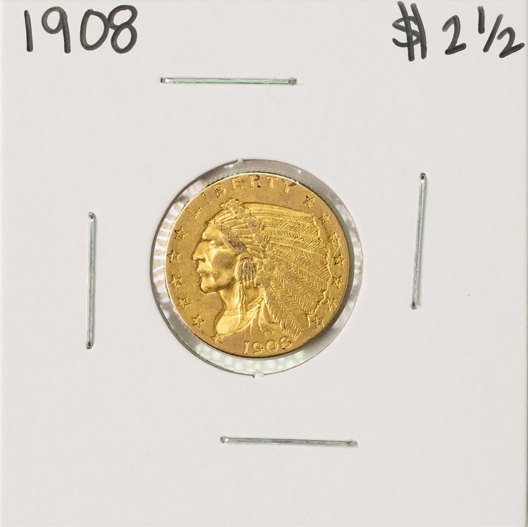 One 1908 $2 1/2 Indian Head Quarter Eagle Gold Coin.