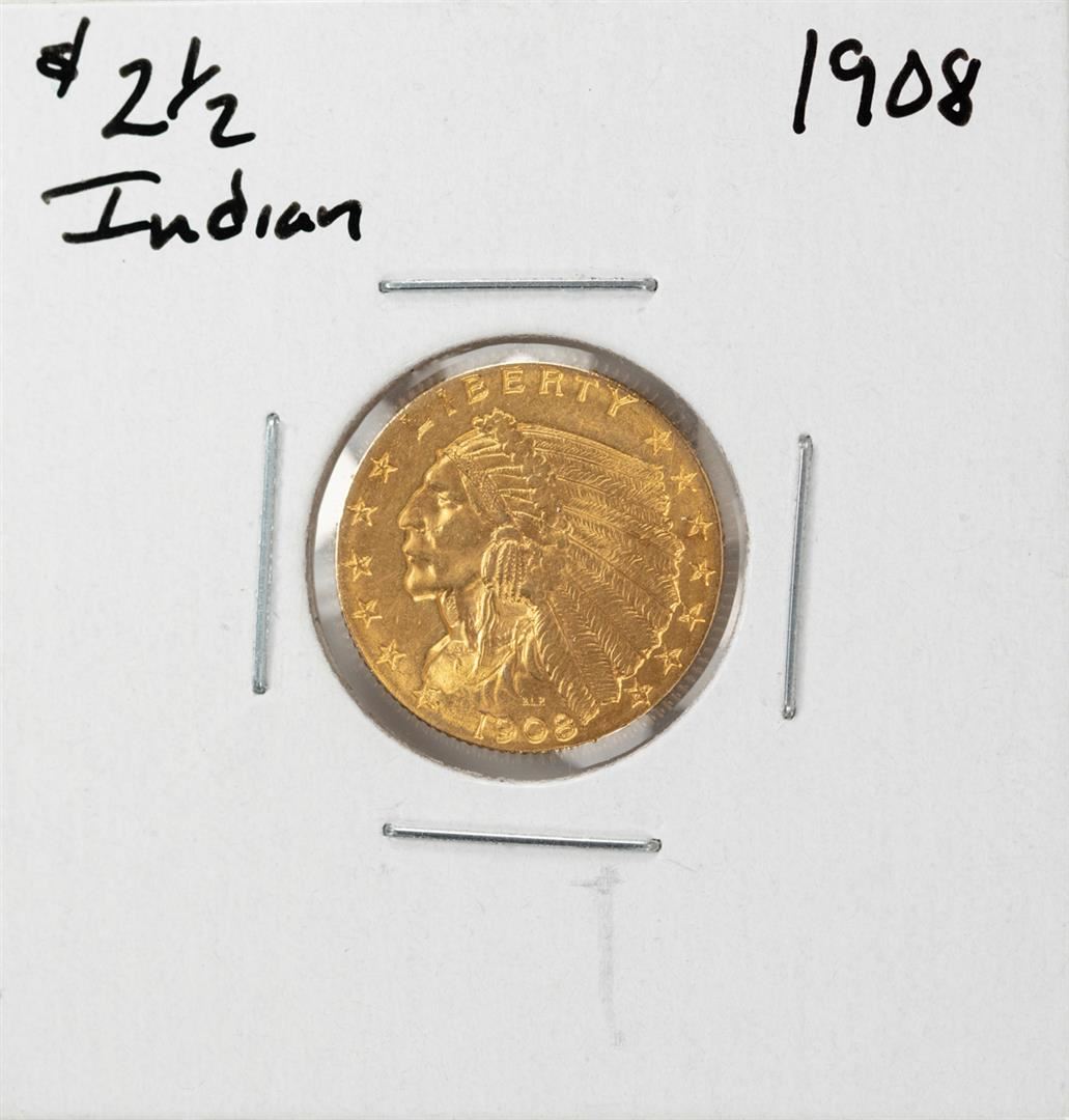 One 1908 $2 1/2 Indian Head Quarter Eagle Gold Coin.